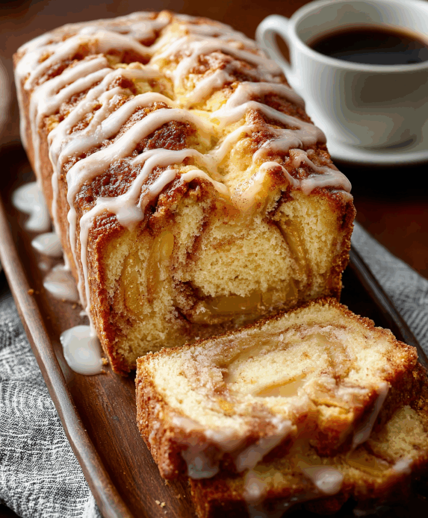 A warmly spiced, moist loaf brimming with tender apple chunks and infused with cinnamon—an inviting treat ideal for cozy gatherings or a quiet moment with coffee, any season of the year.