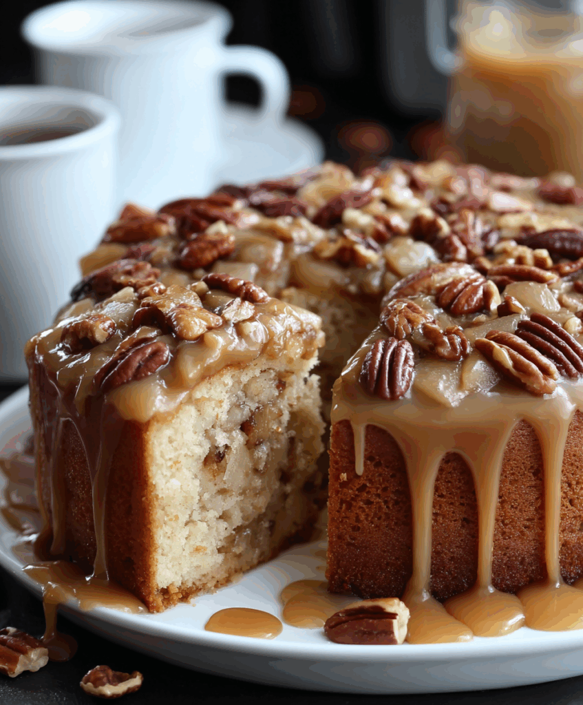 It starts with a tender cinnamon-spiced cake packed with juicy apple pieces and crunchy pecans, then gets drenched in a buttery brown sugar caramel glaze while it’s still warm. The glaze seeps into the top, creating a glossy layer that’s part frosting, part sauce — and it makes every bite rich, moist, and totally irresistible.