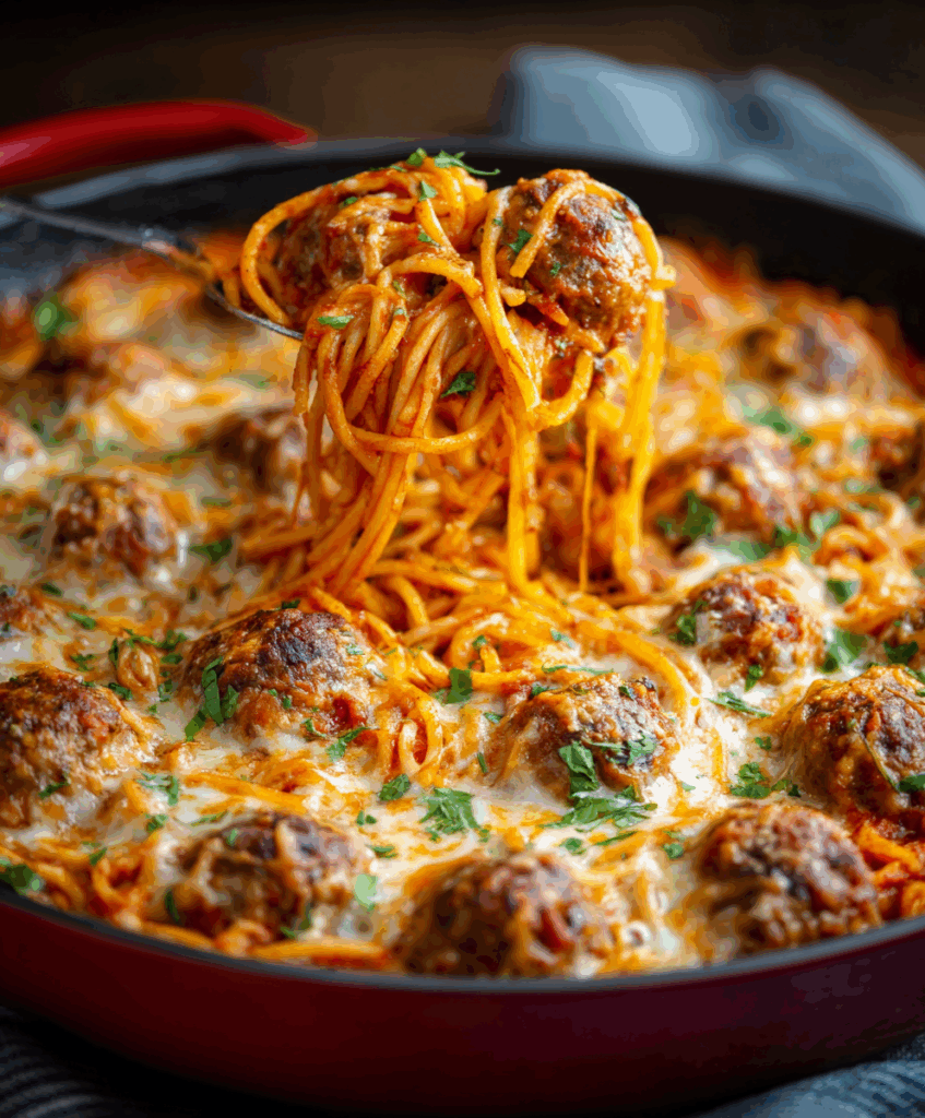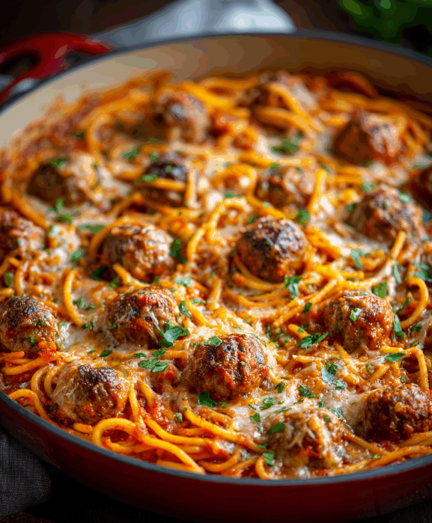 Instead of serving spaghetti and meatballs separately, this version bakes the pasta, marinara, and meatballs together under a blanket of mozzarella and Parmesan so all the flavors meld in the oven. You still get tender pasta, juicy meatballs, and a rich tomato sauce, but now there’s that irresistible cheesy top and cozy casserole vibe. It’s perfect for weeknight dinners, potlucks, game days, or when you just want something everyone at the table will actually eat without complaining.