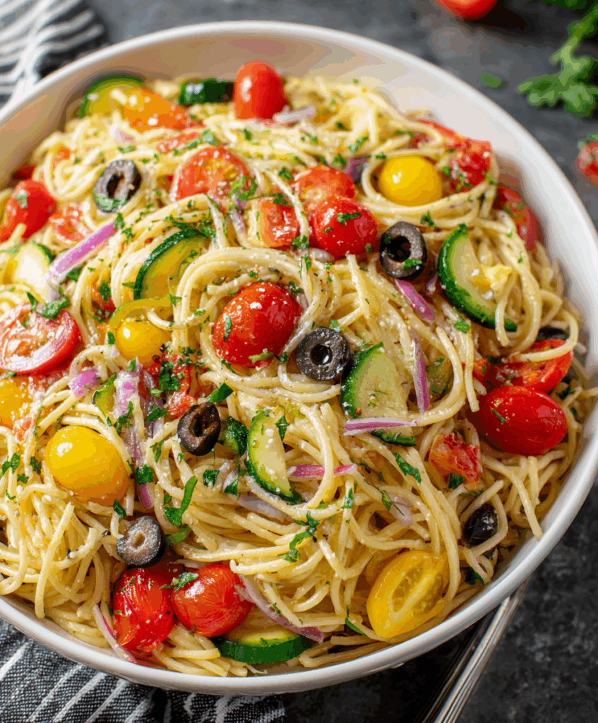 California Veggie Spaghetti Salad is a bright, make-ahead pasta salad loaded with crisp vegetables, spaghetti, and zesty Italian dressing—perfect for potlucks, picnics, and busy weeknights.