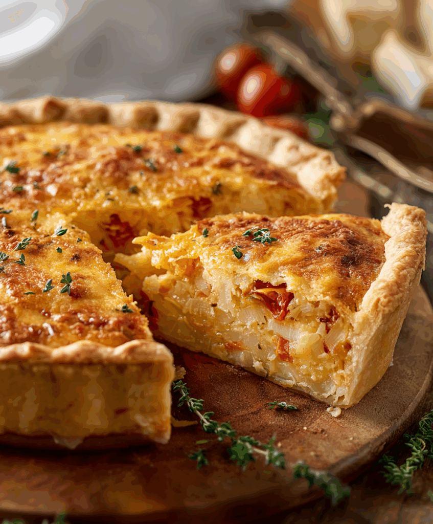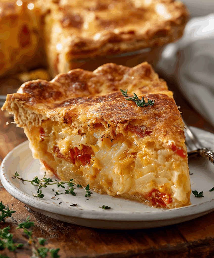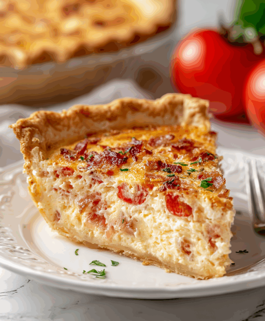 Creamy, savory Cheesy Bacon Tomato Onion Pie layered with juicy tomatoes, caramelized onions, smoky bacon, and melty cheese in a flaky crust.