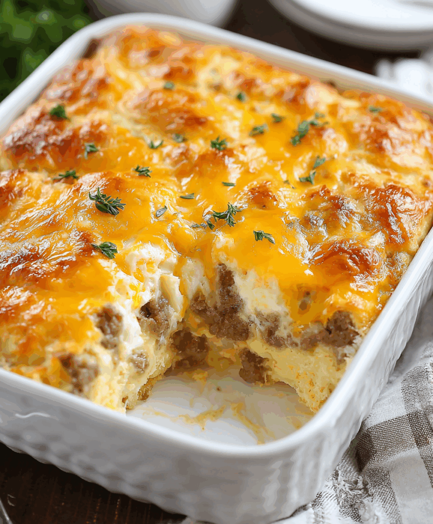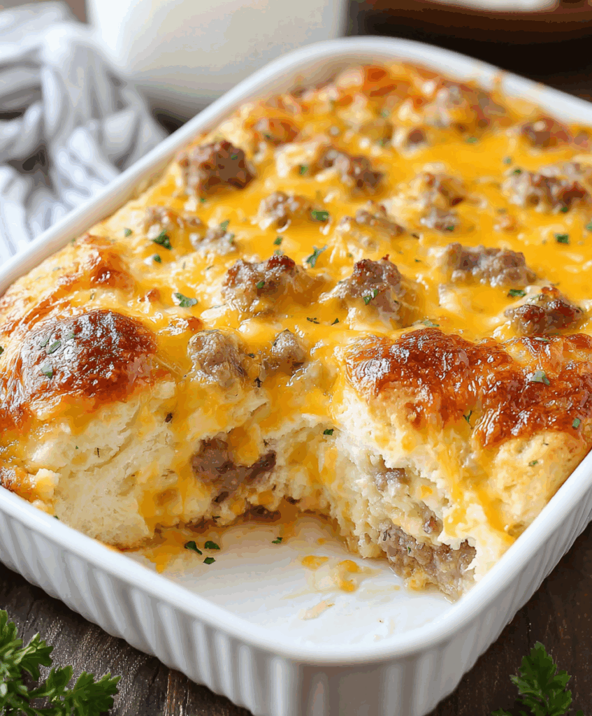 Comforting, savory, and irresistibly cheesy, this Cheesy Sausage Biscuit Casserole captures the spirit of a full Southern breakfast in one dish — easy enough for a weekday morning, special enough for Sunday brunch.