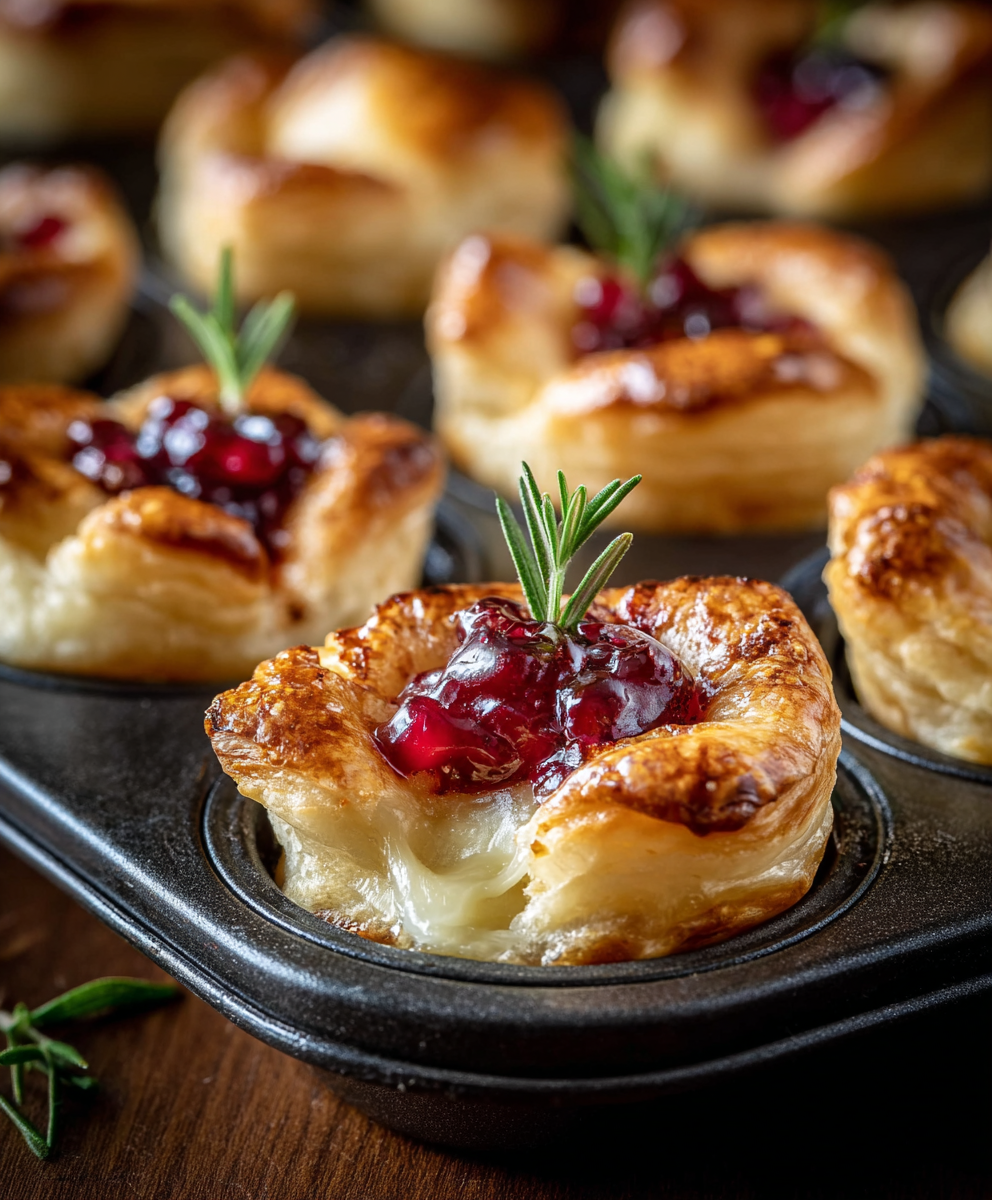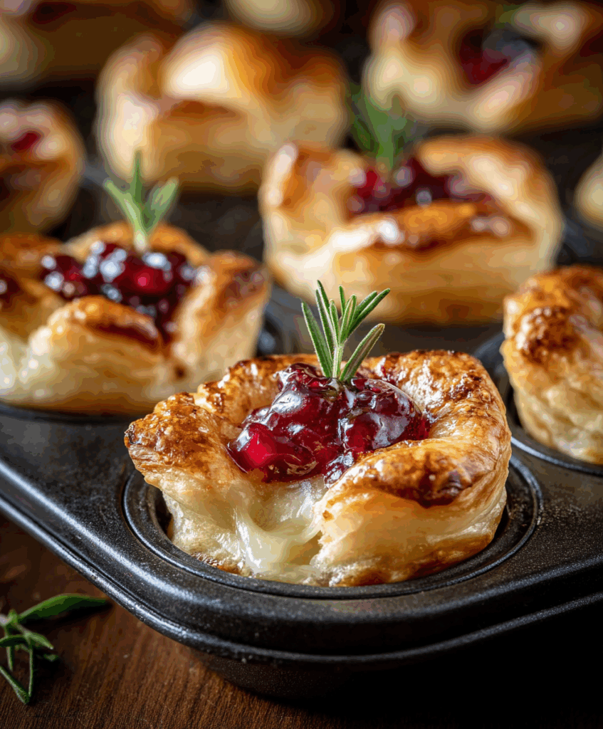 They’ve got everything going for them: puff pastry that bakes up golden and crisp, creamy Brie in the center, tangy cranberry sauce for brightness, and a little rosemary (plus nuts, if you like) to make them taste extra festive. They look elegant, but they come together in minutes, which makes them perfect for holiday parties, Friendsgiving, Christmas Eve spreads, or even a fancy-feeling snack night.