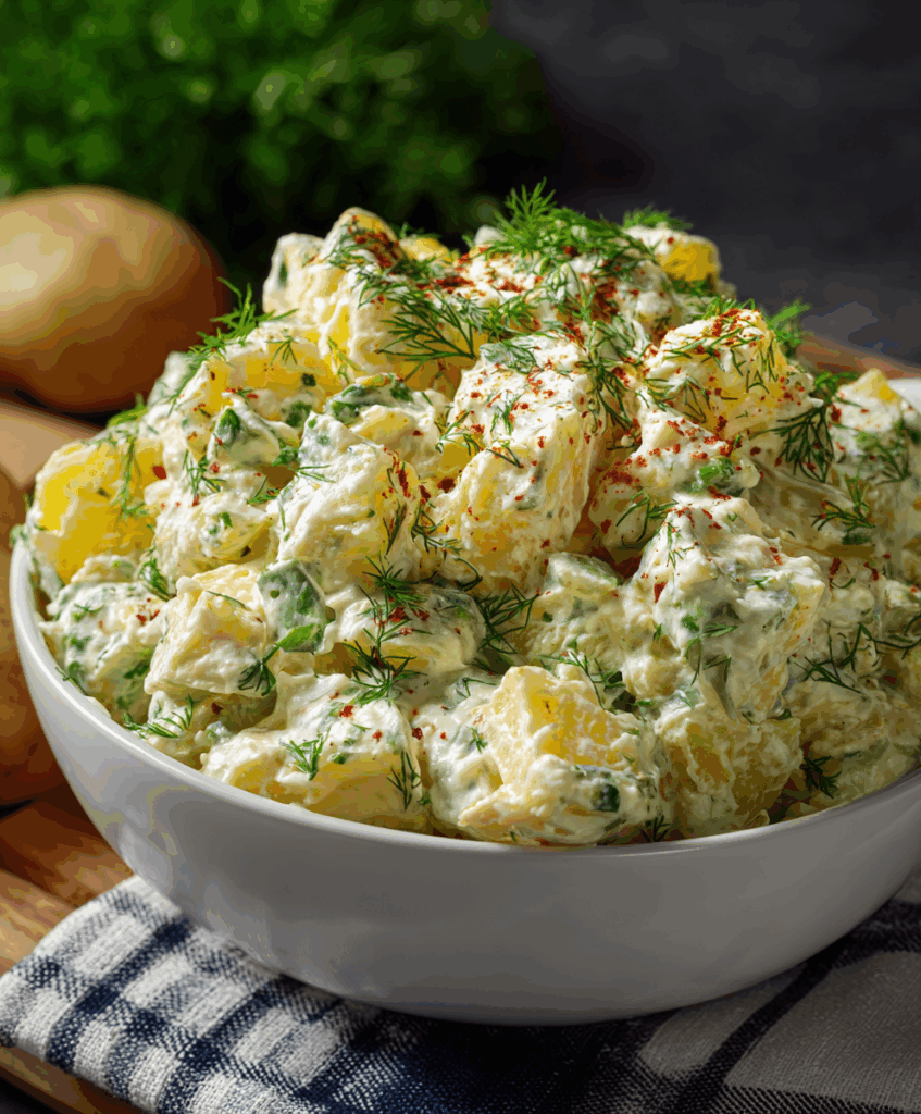 Freezing isn’t recommended because the mayo-based dressing tends to separate once thawed, and the potatoes can turn grainy and watery. It’s best enjoyed freshly made and eaten cold from the fridge.