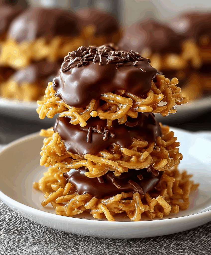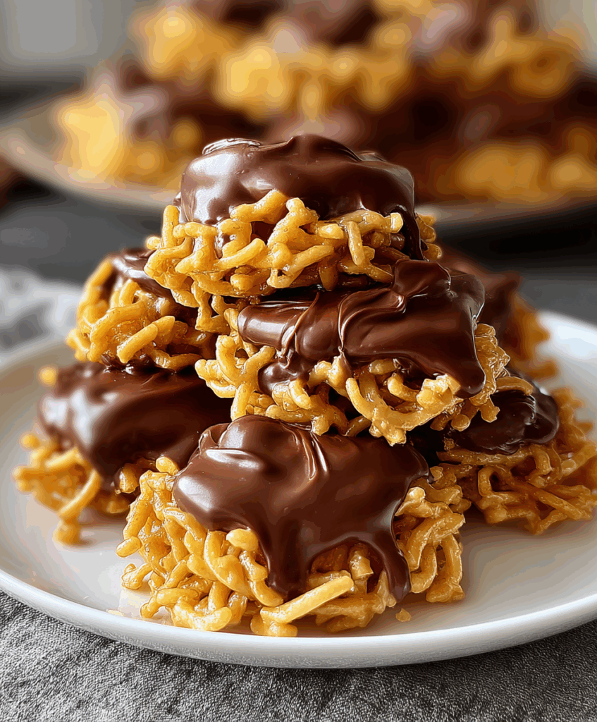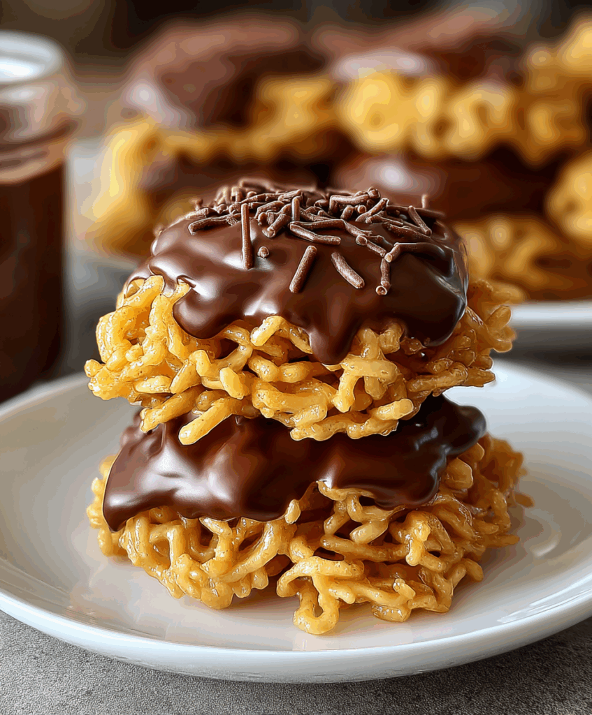 The magic is in the texture: crisp chow mein noodles, creamy peanut butter, and melty chocolate form sweet “haystacks” that look rustic but taste like a candy shop treat. They’re perfect for cookie trays, bake sales, or a fun afternoon in the kitchen with kids.