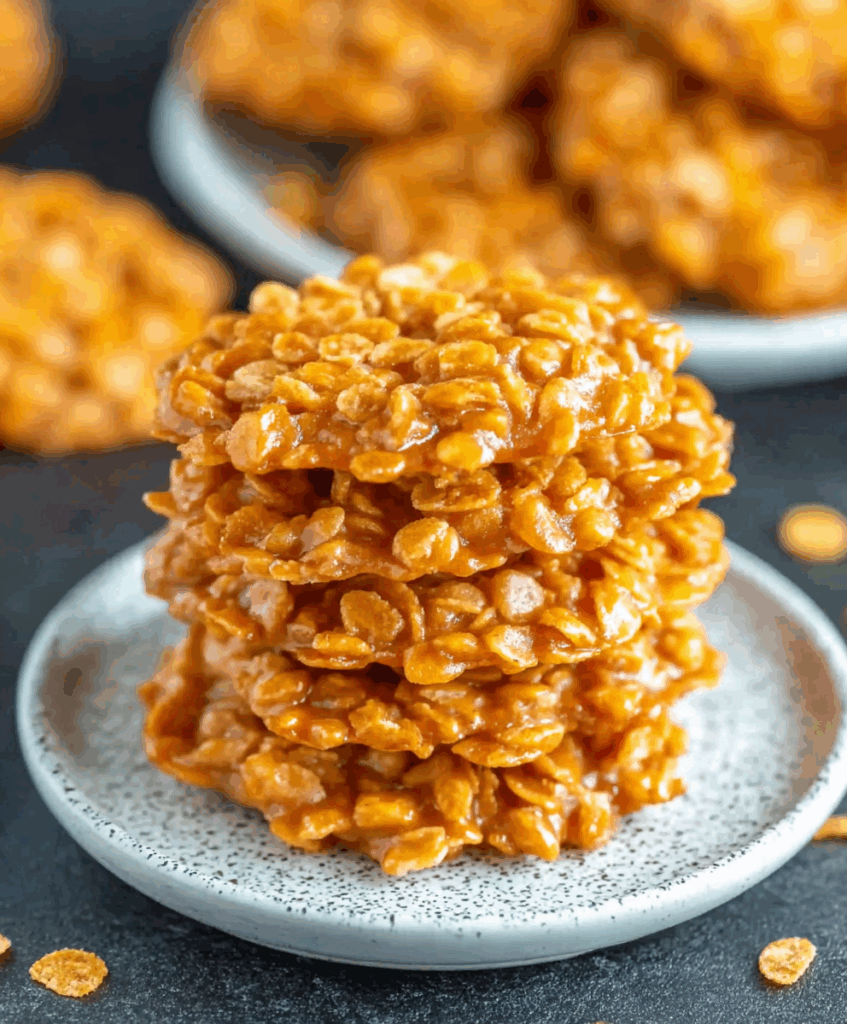 There’s something wonderfully nostalgic about these cookies. They taste like childhood bake sales and after-school snacks, with that familiar peanut butter aroma and shattery cornflake crunch. You only need a saucepan, a spoon, and a baking sheet to bring them together.