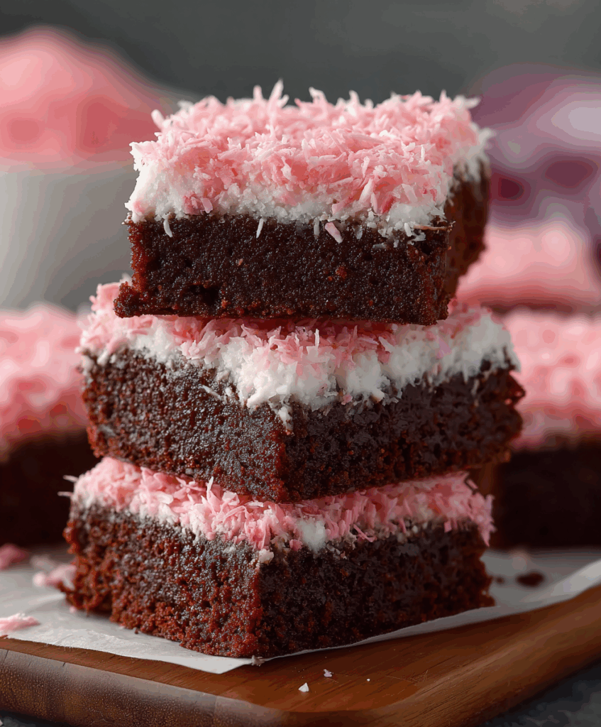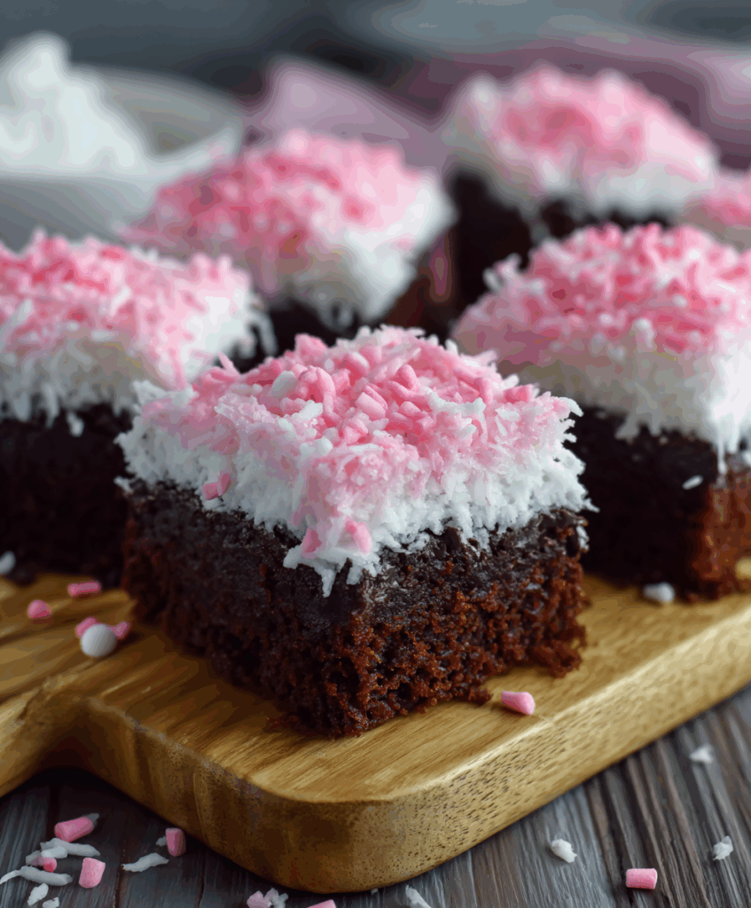 These Fudgy SnoBall Brownie Squares combine rich chocolate, fluffy marshmallow, and pink coconut for a nostalgic party-ready dessert everyone will crave.