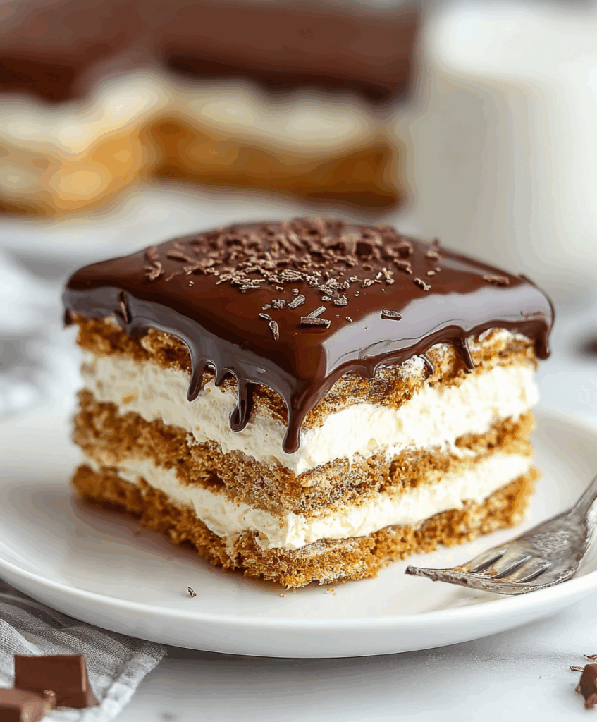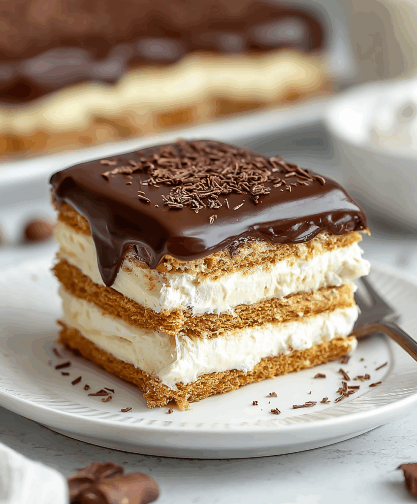 Chocolate éclair dessert meets no-bake ease: layers of graham crackers, fluffy vanilla cream, and a glossy chocolate top that slice like a bakery treat.