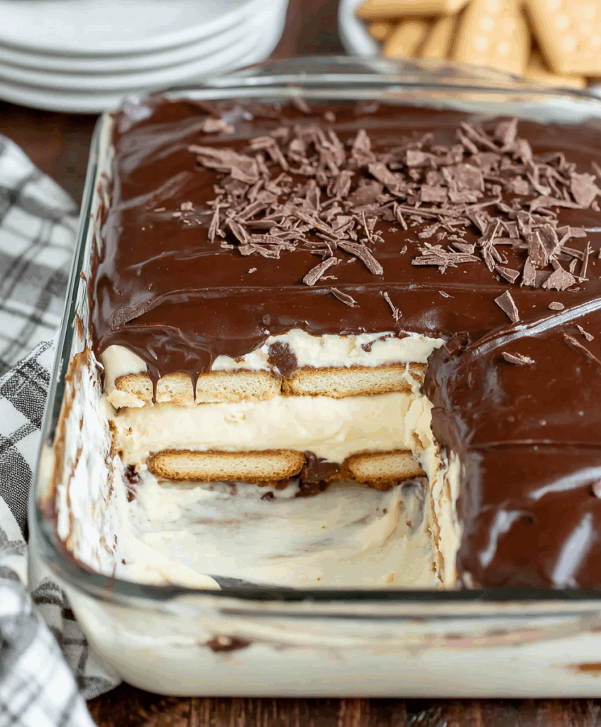 This pan dessert is all about texture harmony—softened graham crackers that turn cakelike, a cloud of vanilla pudding folded with whipped topping, and a tidy sheet of chocolate that chills to a smooth, fork-friendly finish. It delivers that “éclair” nostalgia without fussy choux or stovetop custard, and the results are remarkably elegant for a refrigerator cake.