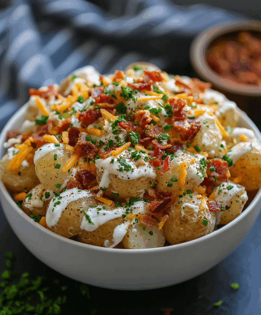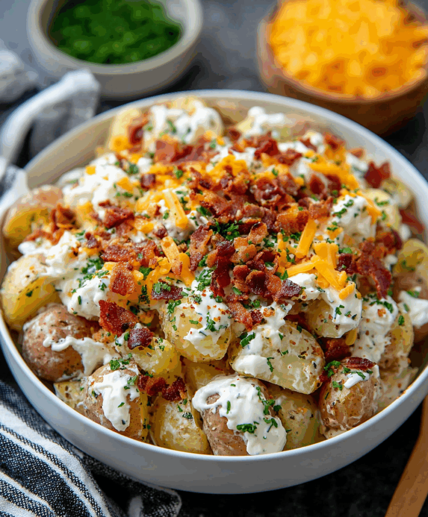 This loaded bacon cheddar potato salad takes everything you love about a baked potato and turns it into a rich, creamy, and completely irresistible side dish.