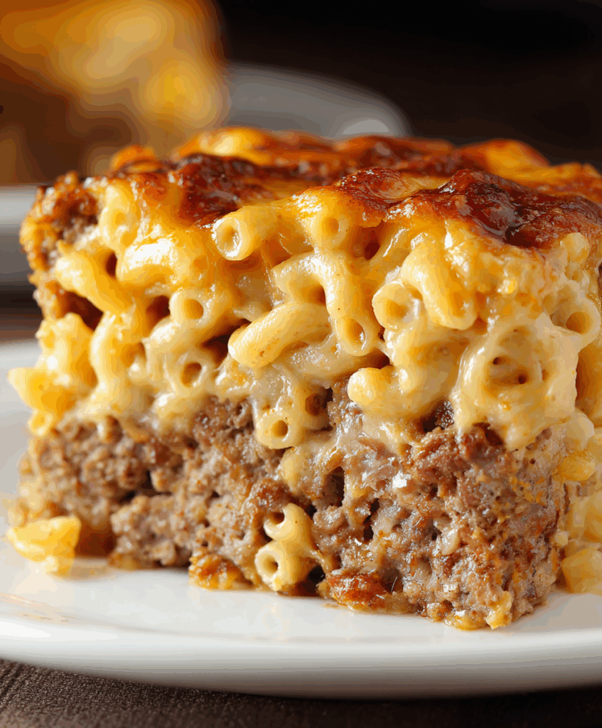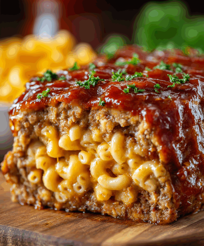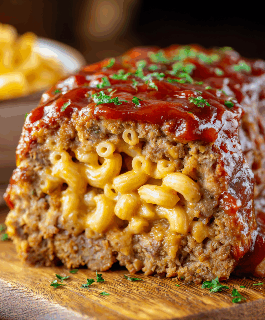 This mac and cheese meatloaf is exactly the kind of cozy dinner you make when nobody can decide between two favorites. You get a juicy, well-seasoned meatloaf on the outside and creamy, sharp-cheddar macaroni baked right inside. It slices beautifully, feeds a family, and looks impressive enough for potlucks or Sunday dinner. The best part is that the ingredients are simple, and everything bakes together in one pan so the flavors meld — savory beef, ketchup glaze, and that golden mac and cheese layer.