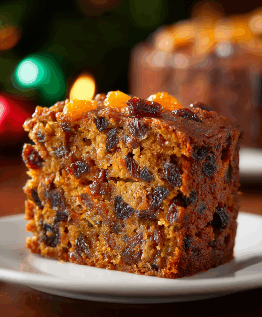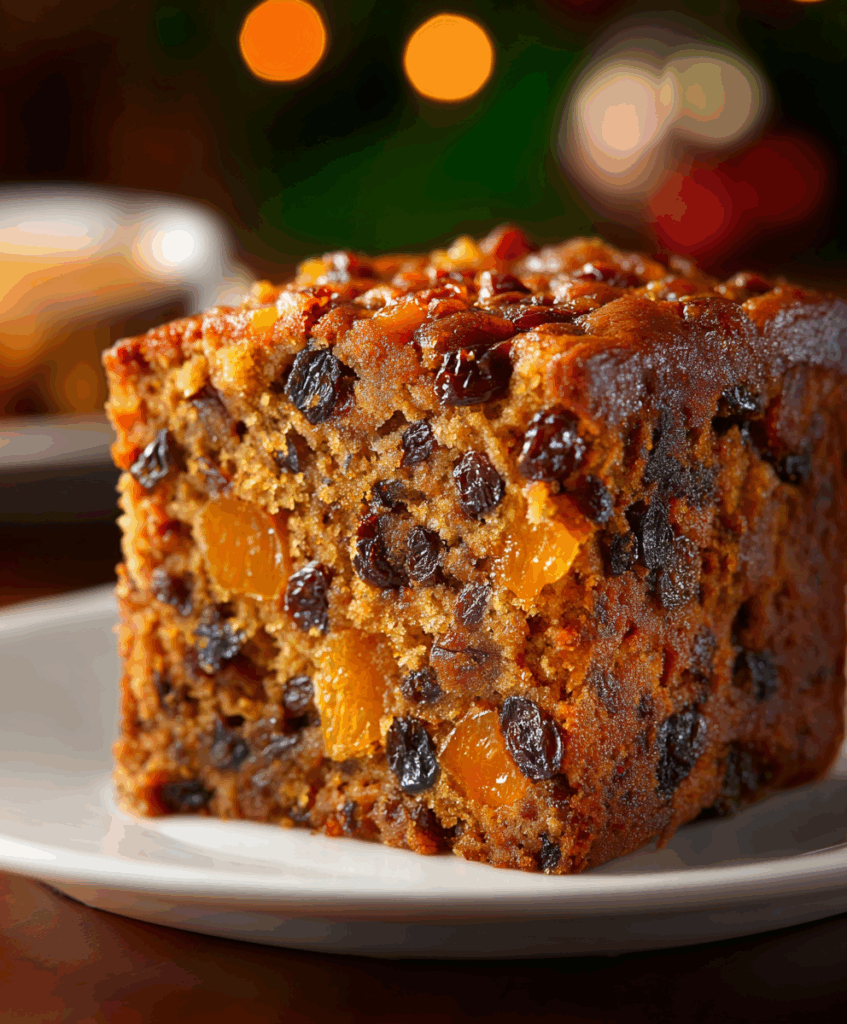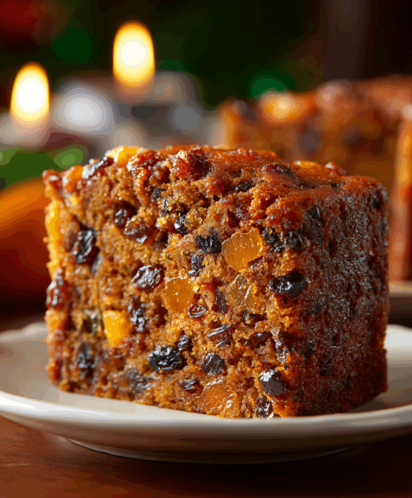 Spiced Moist Fruit Cake is a rich, boozy loaf packed with plump dried fruit and warm spice, perfect for cozy holiday gatherings.