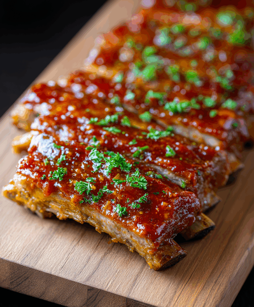 STEP 6: When the ribs are very tender, carefully transfer them to a foil-lined baking sheet. Brush them with extra BBQ sauce, then broil for 3–5 minutes until the sauce bubbles and the edges are slightly charred.