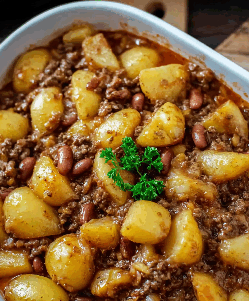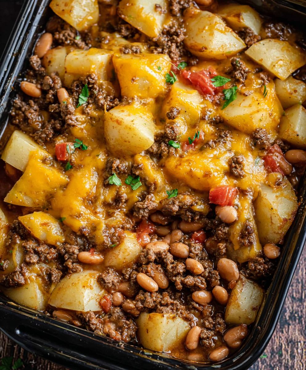 Cheesy Cowboy Potato Beef Casserole slow-cooks beef, beans, tomatoes, and potatoes under melty cheese for hearty, hands-off comfort every time.