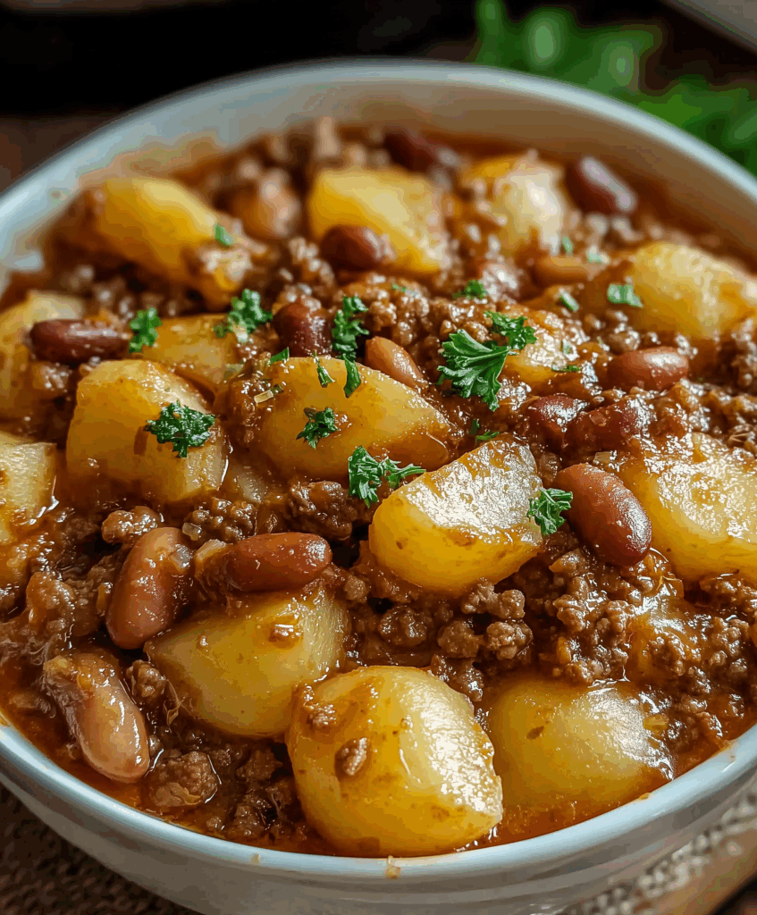 Everything here leans pantry-friendly and unfussy: brown the beef with onions and garlic, stir in the cans and spices, tuck in thinly sliced potatoes, and let low, steady heat do the rest. The result is spoonable, savory, and deeply satisfying—cowboy casserole spirit with slow-cooker ease.