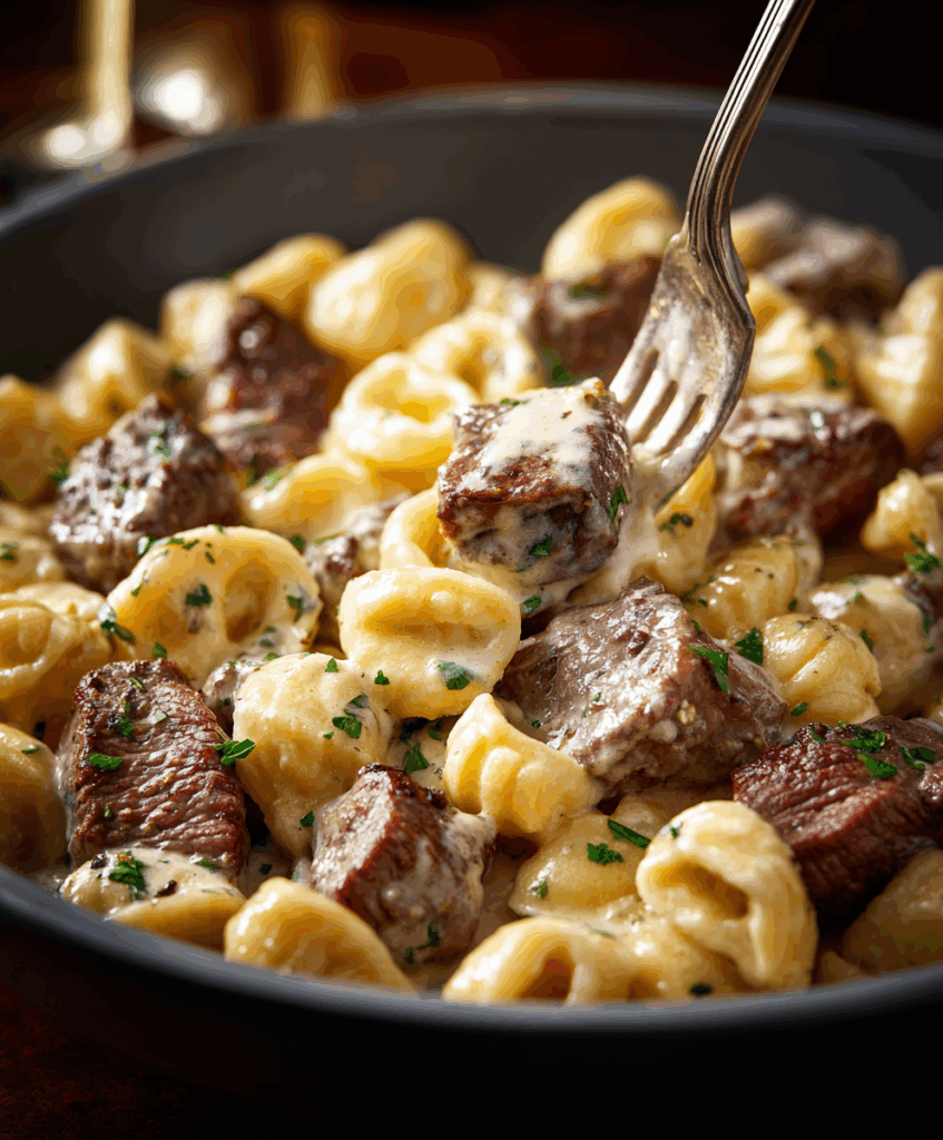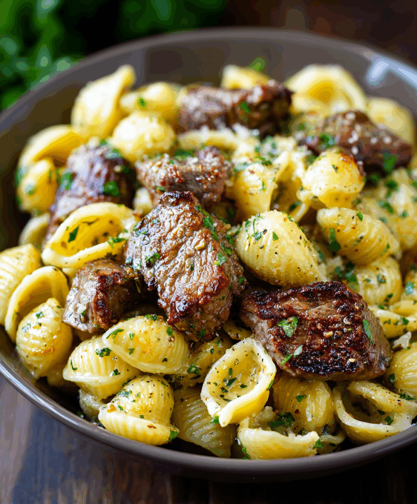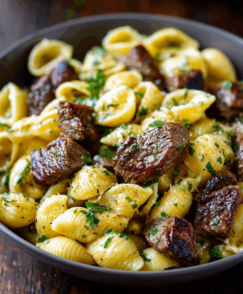 It’s a restaurant-quality meal made simple—juicy, seared steak bites tossed with tender pasta shells and coated in a velvety Parmesan Alfredo sauce infused with garlic and butter. Every bite combines the hearty comfort of pasta with the savory satisfaction of steak, all in one skillet.