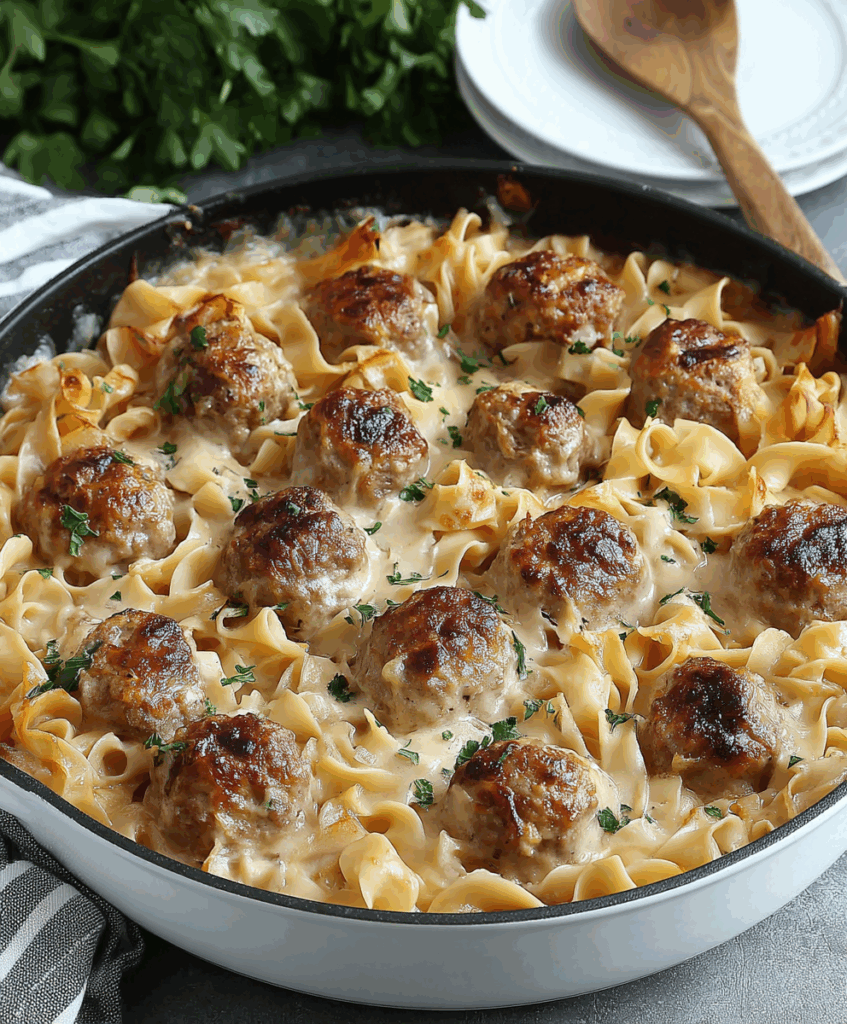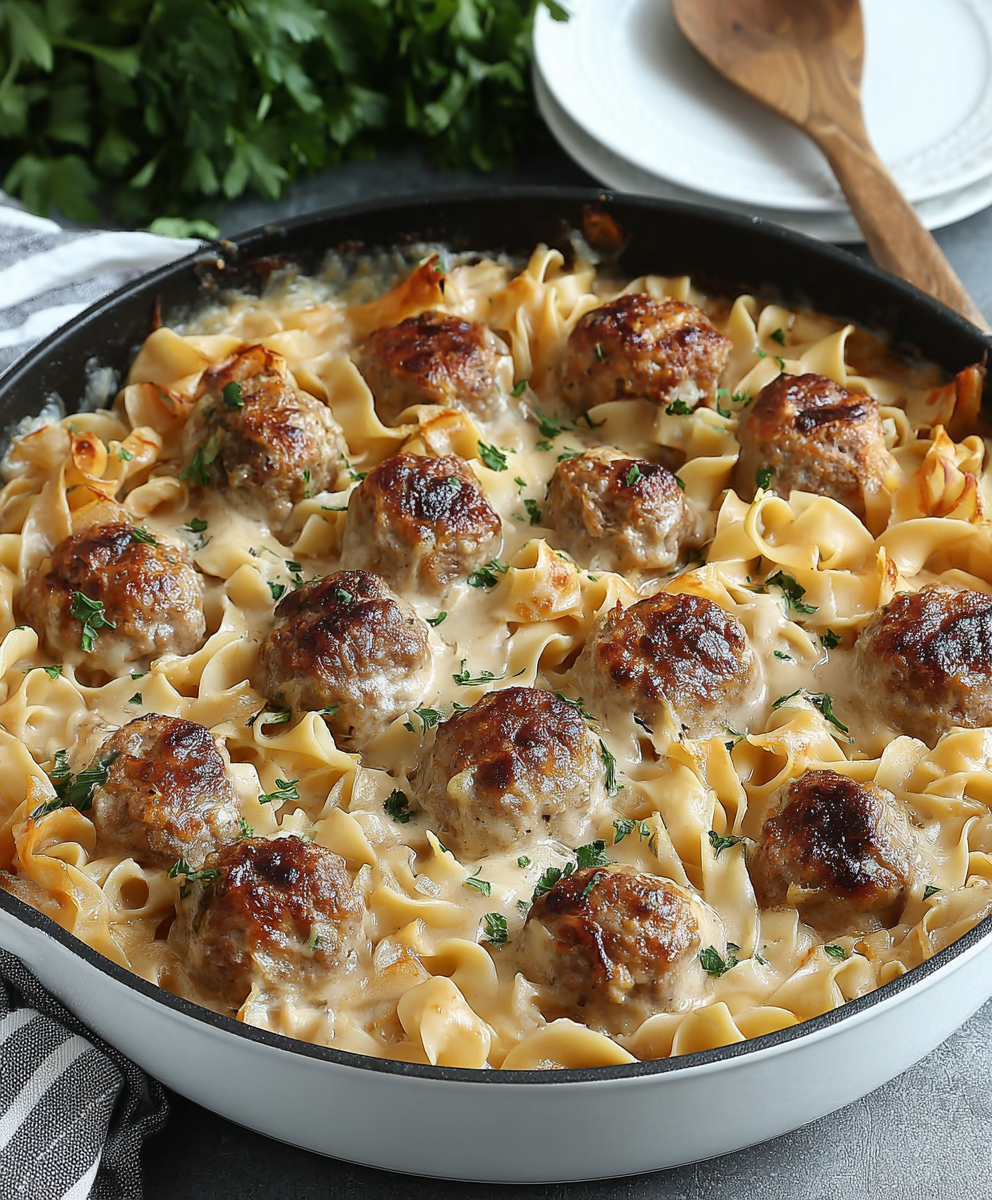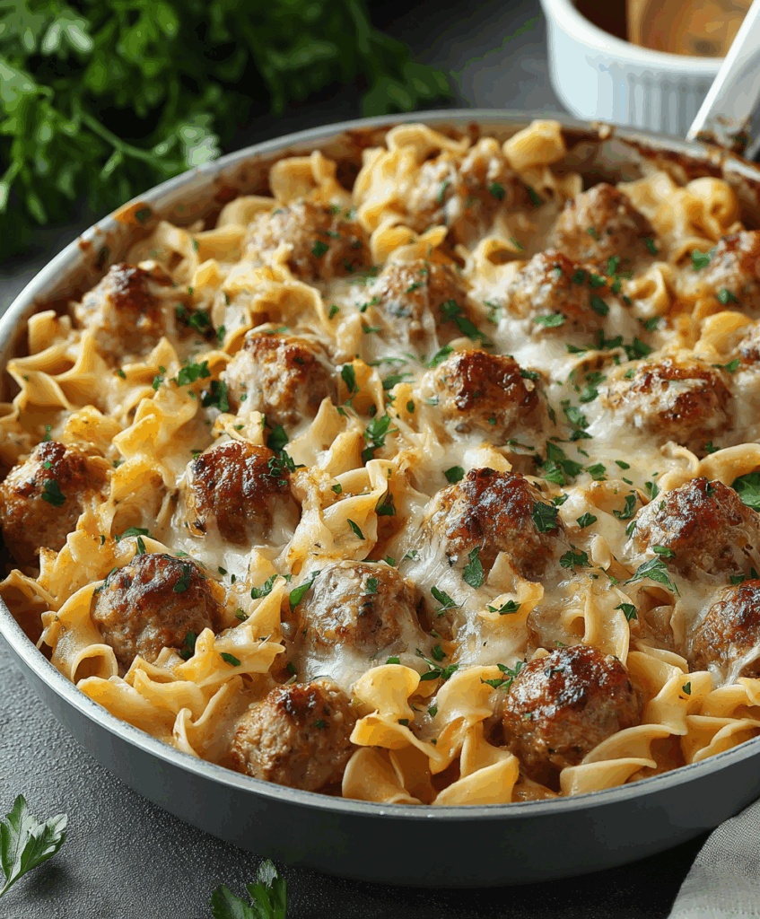 STEP 6: Let the casserole rest for 5 minutes before serving. Garnish with fresh chopped parsley if desired and serve hot. Each bite delivers tender noodles, creamy sauce, and perfectly seasoned meatballs wrapped in melted cheese — pure comfort food bliss.