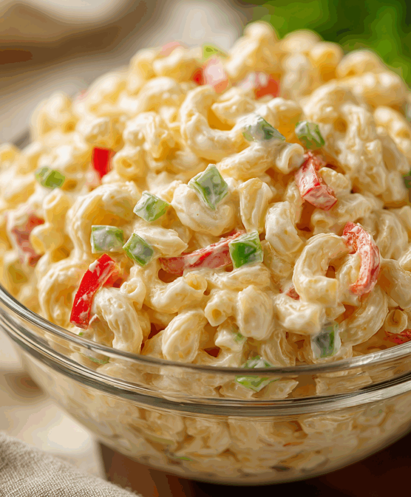 This version stays true to its roots with tender elbow macaroni, a creamy mayo-based dressing, chopped eggs, and a pop of crunch from celery and bell pepper. The secret lies in that classic sweet-tangy dressing made with sugar, vinegar, and mustard — it’s what makes each bite bright, creamy, and completely addictive.