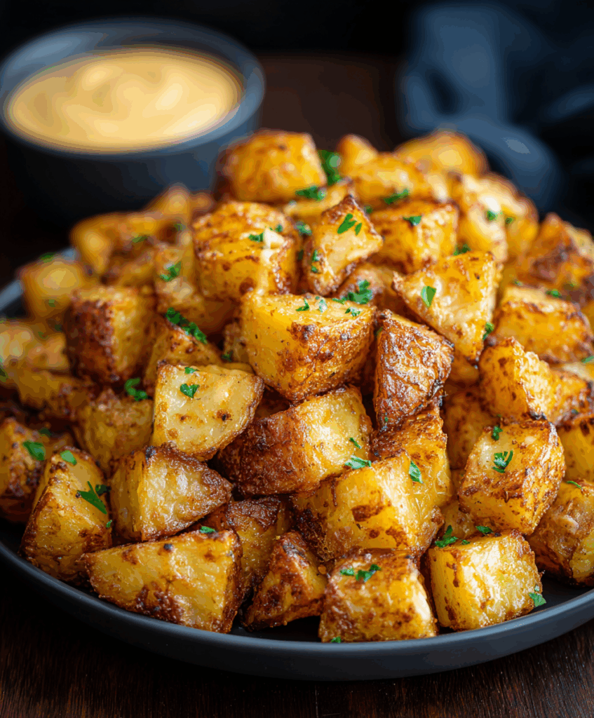 Cut the potatoes into evenly sized cubes so they roast uniformly and crisp without burning. A hot oven is essential for achieving the right texture, and flipping halfway ensures both sides brown well.