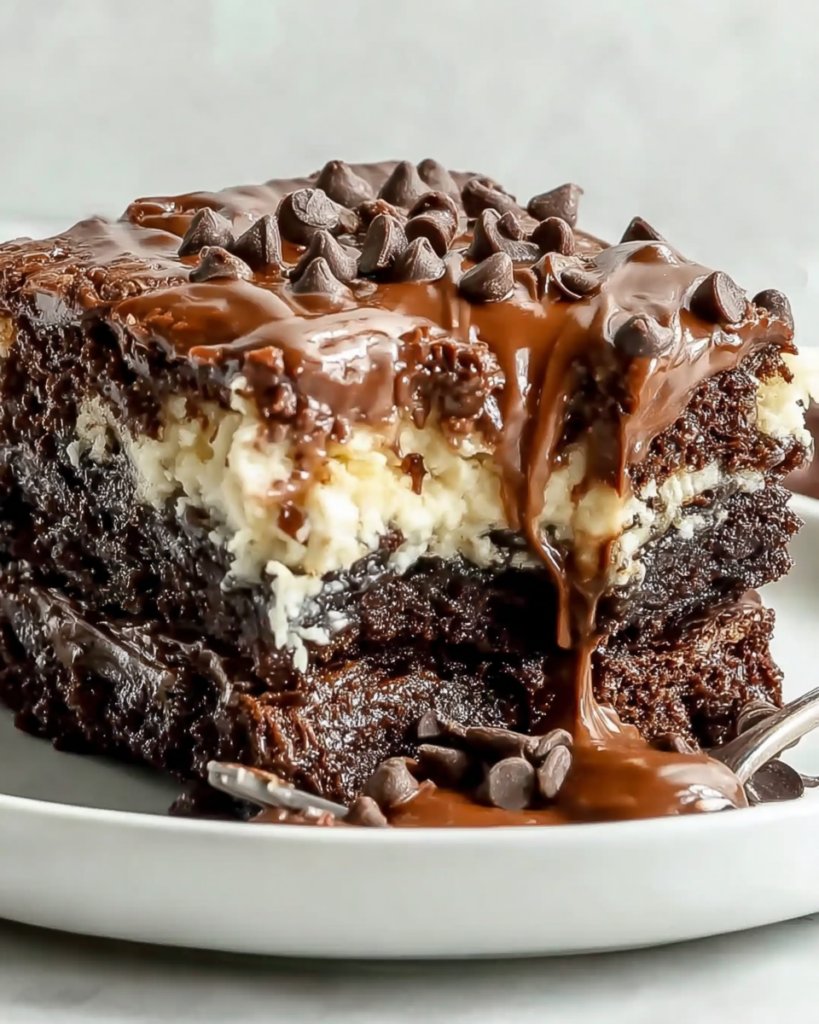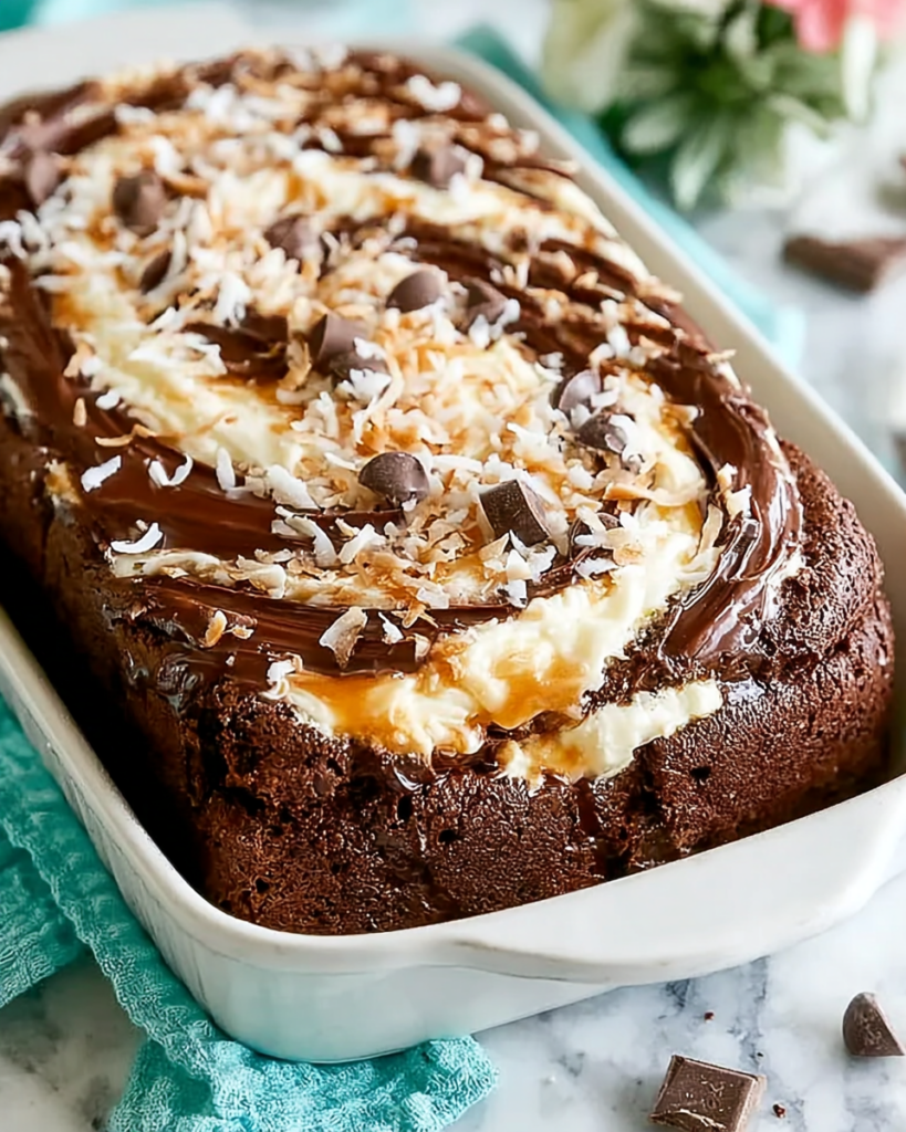 What makes this cake work so well is the contrast. You get soft chocolate cake, pockets of sweet almond cream cheese, bits of toasted coconut, and melted chocolate in every slice, so it tastes layered and interesting without being fussy.