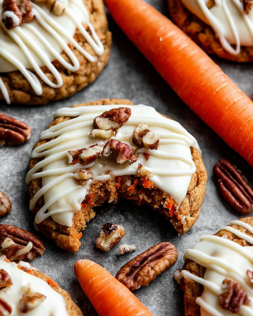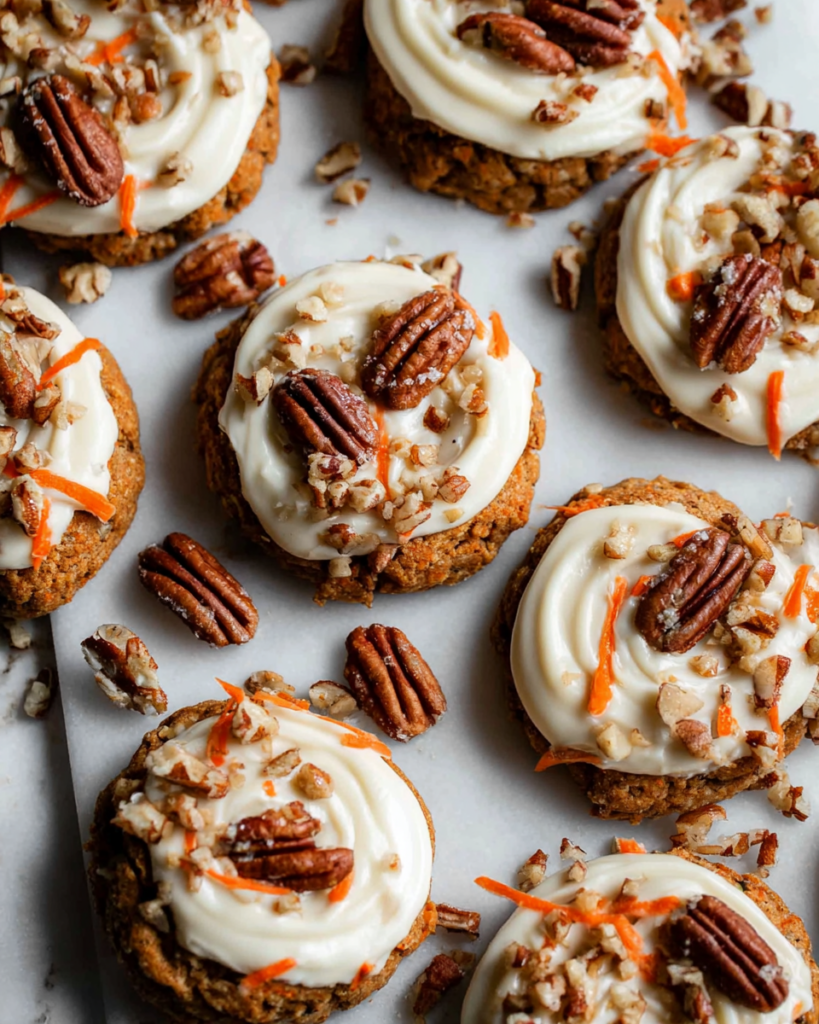 These soft carrot cake cookies are finished with a smooth cream cheese frosting and a drizzle of salted caramel. Warm cinnamon, finely ground pecans, and freshly grated carrots give each cookie the familiar character of classic carrot cake in a handheld form.