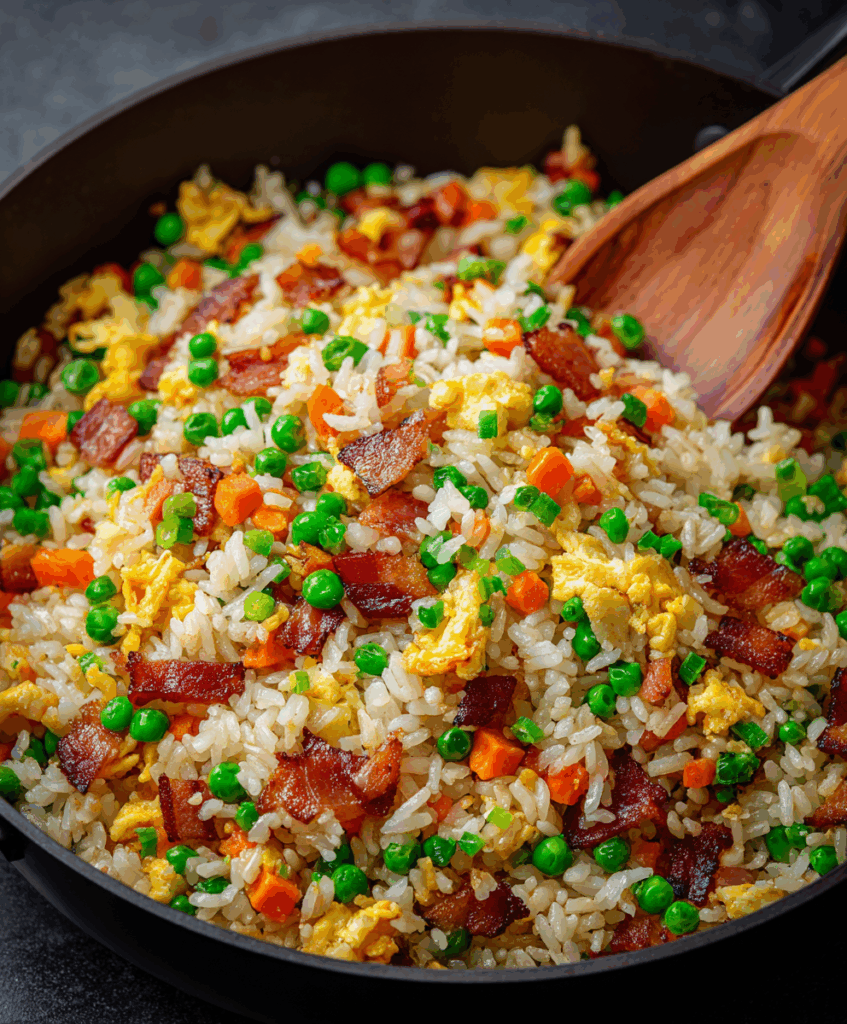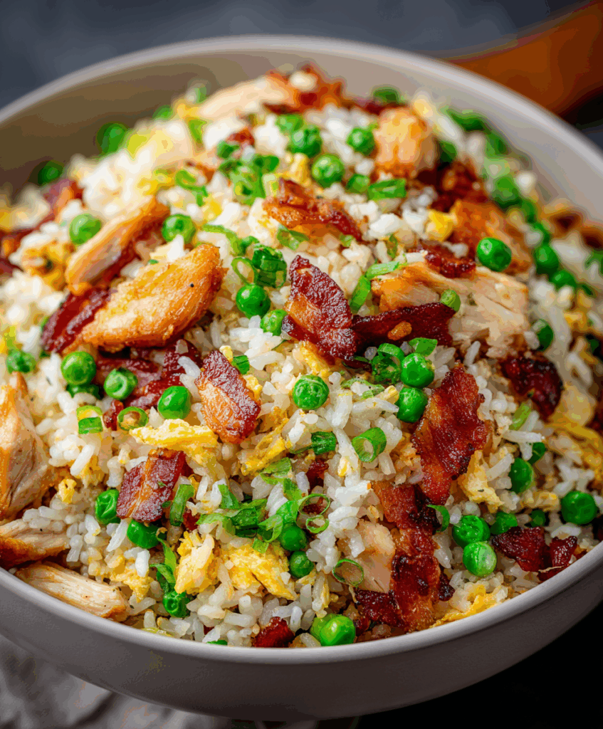 There’s something so satisfying about turning simple leftovers into a craveable, restaurant-style meal. This chicken and bacon fried rice is exactly that kind of dish—savory, slightly smoky from the bacon, and perfectly sauced so every grain of rice is full of flavor.