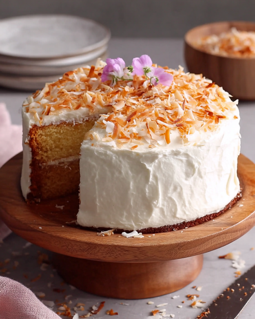 Toasted coconut flakes add texture and a slightly nutty contrast that makes the final cake feel complete.