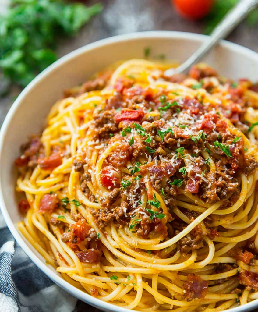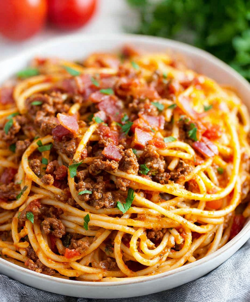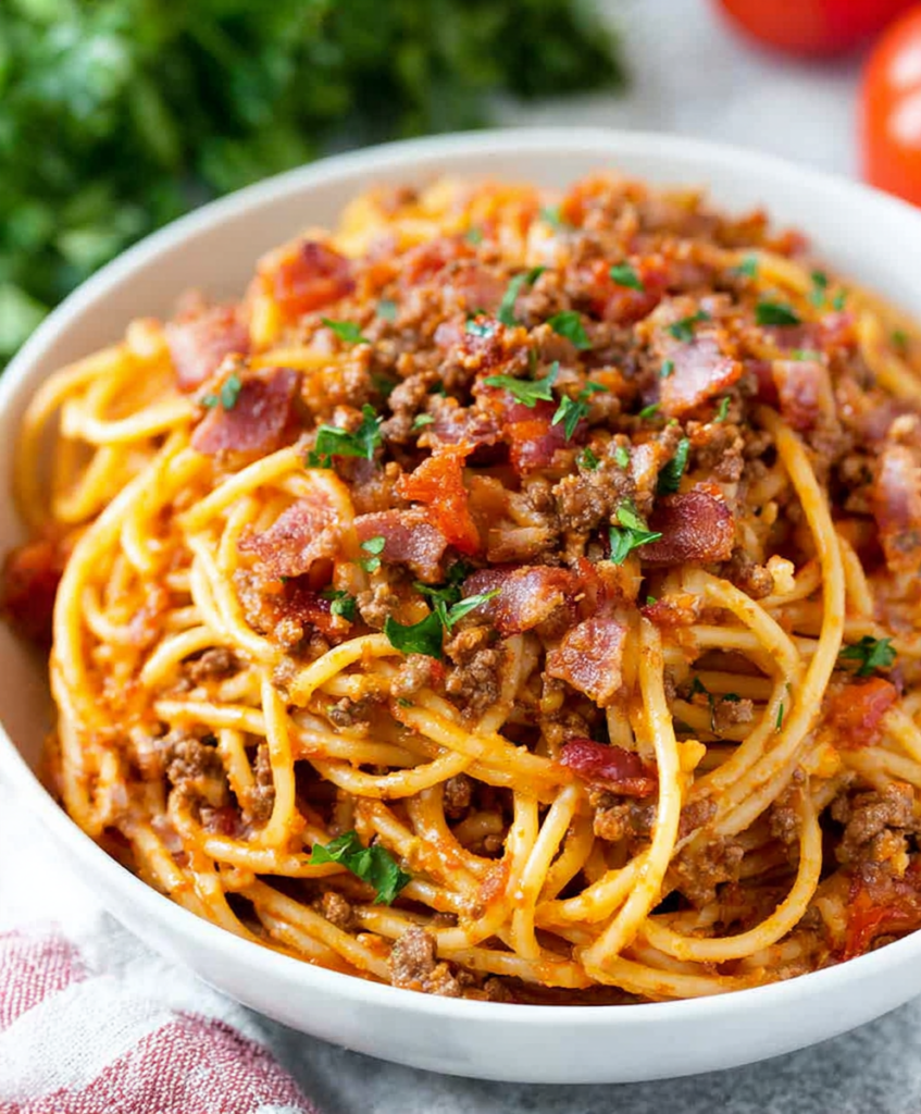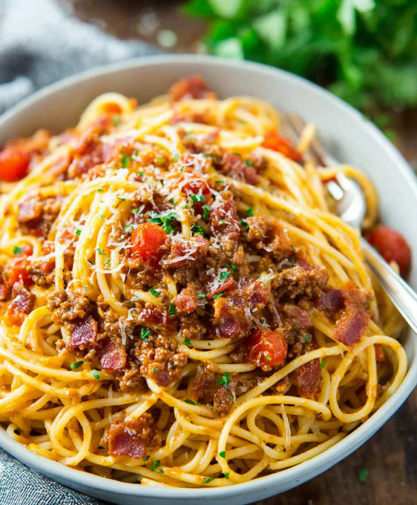 You get crispy bacon, juicy ground beef, and a tomatoey sauce layered with chili powder, smoked paprika, and just enough hot sauce to make things interesting. Toss it all with tender spaghetti and a handful of cheese, and you’ve got a hearty dinner that feels special without any fussy steps.
