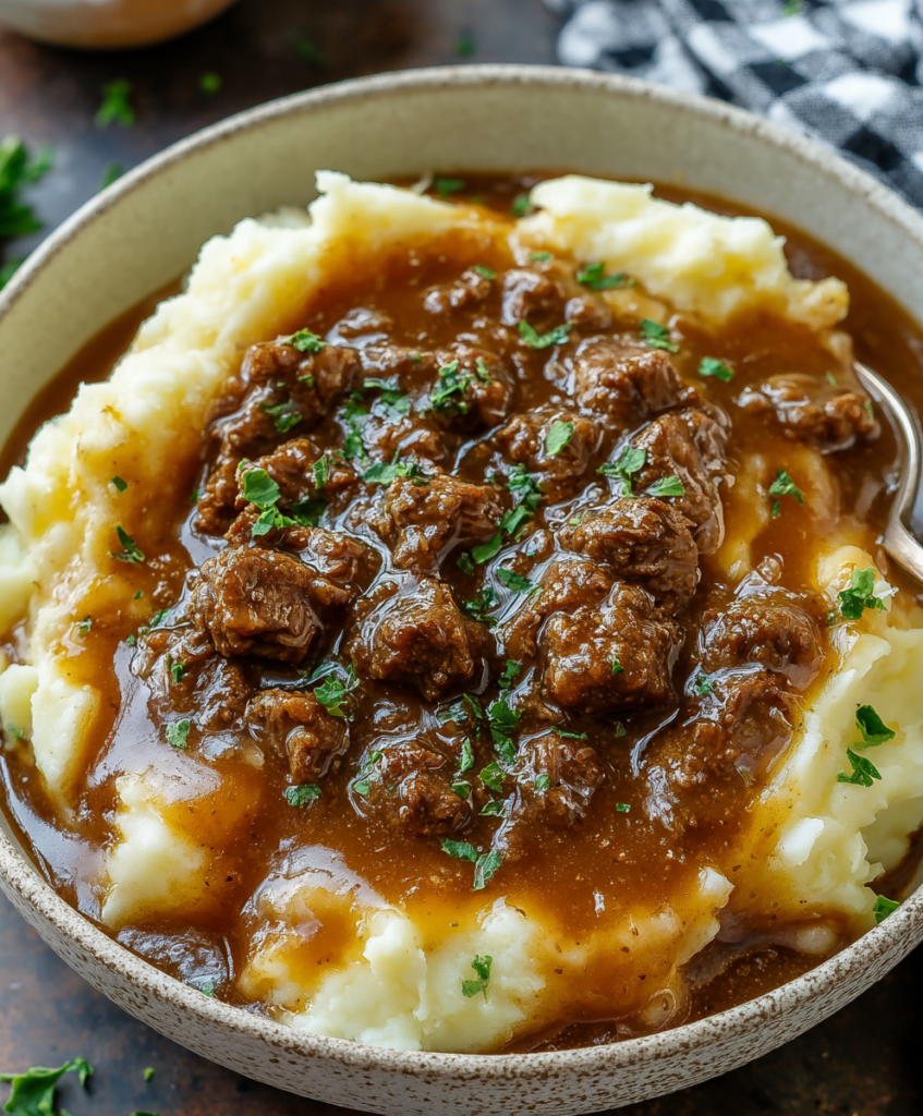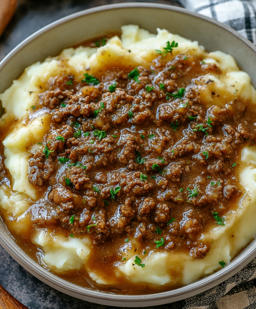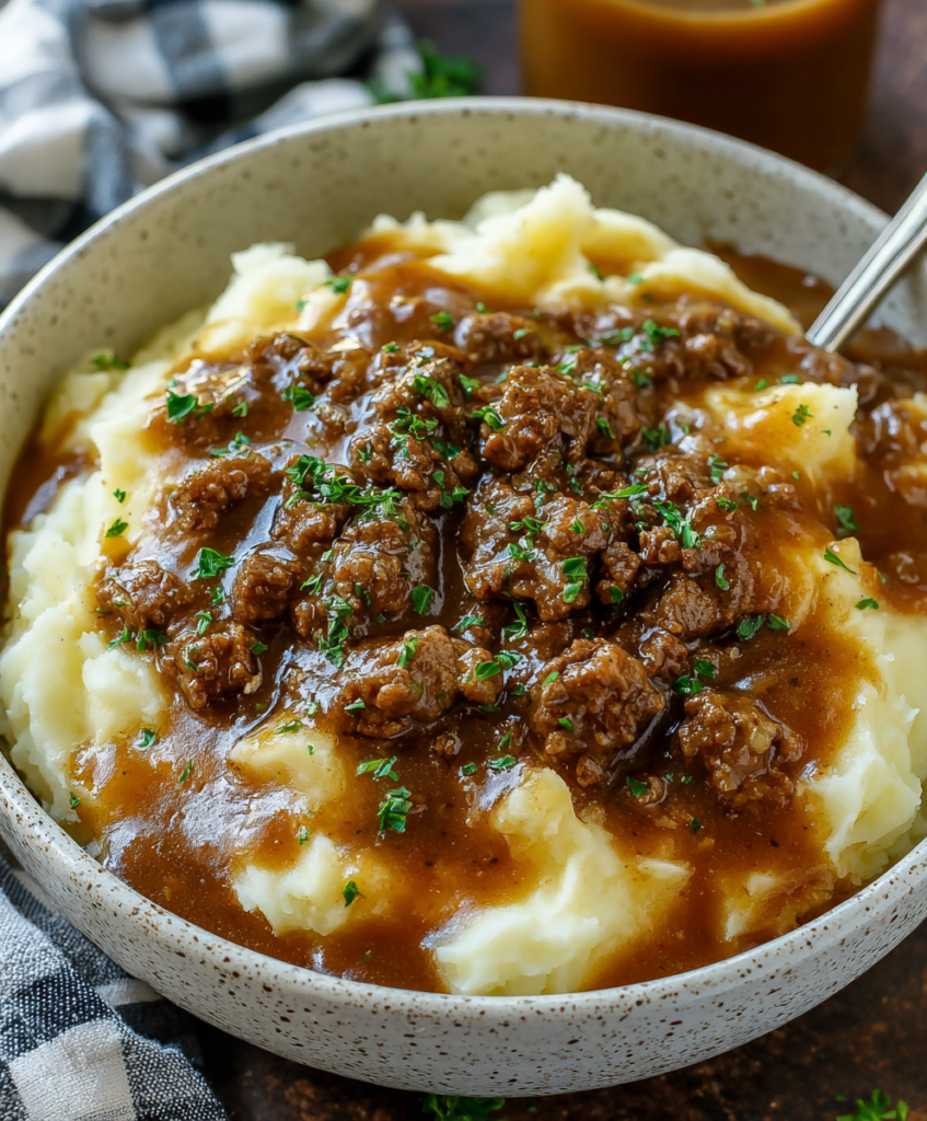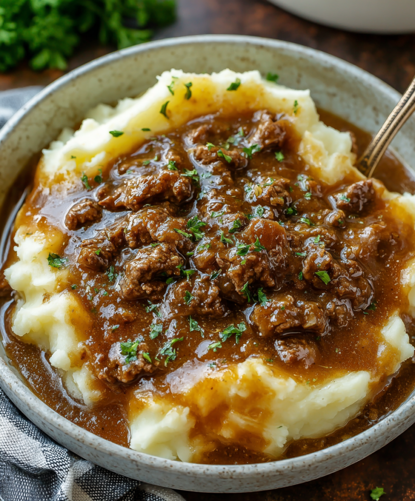 There’s something incredibly comforting about a bowl of creamy mashed potatoes smothered in hearty ground beef gravy. It feels like a hug from the inside out—simple ingredients, big flavors, and barely any fuss.
