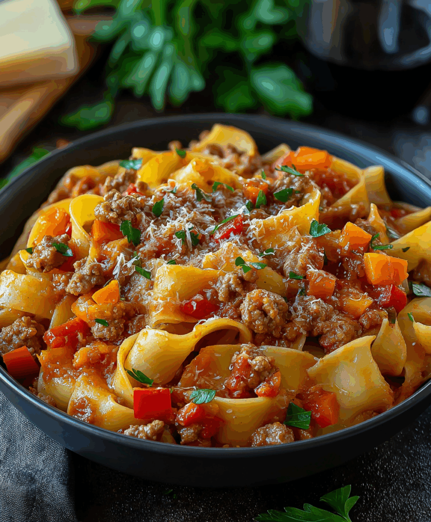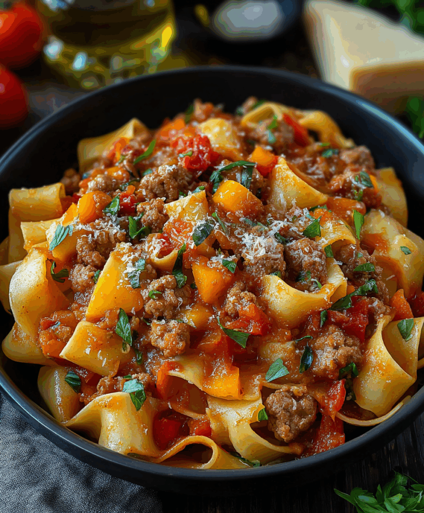 Picture wide ribbons of pasta tangled with juicy Italian sausage, sweet peppers, and a garlicky tomato sauce that’s been kissed with white wine. It’s cozy, a little dramatic, and exactly the kind of food that makes your kitchen smell like an Italian bistro.
