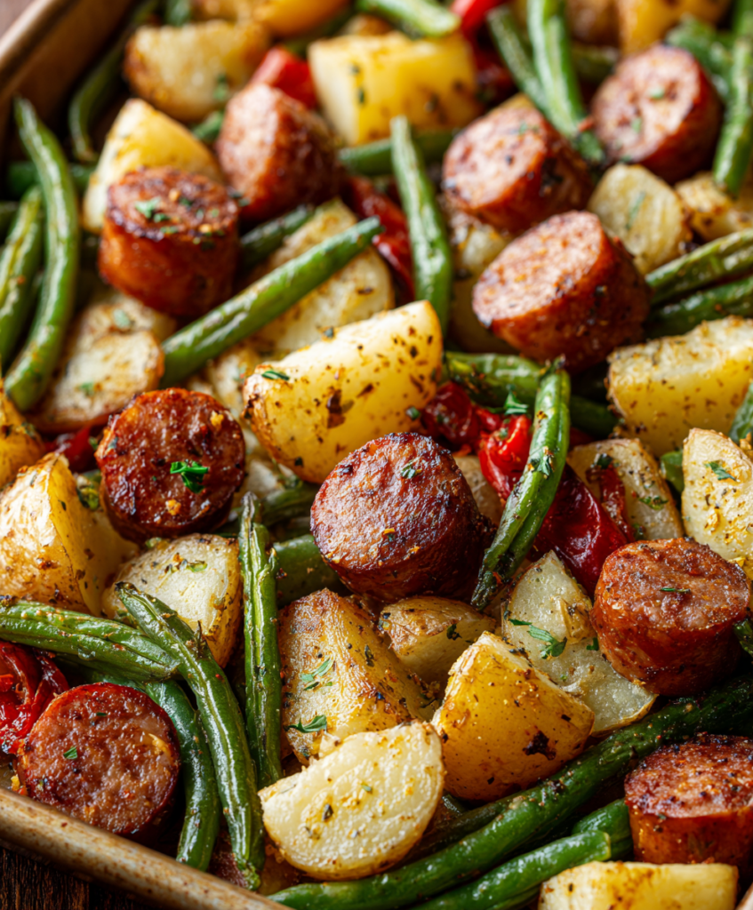 The payoff is big: browned sausage edges, potatoes that turn golden and fluffy inside, and green beans that stay bright with just a little roast-kissed crispness. It’s cozy, satisfying, and reliably delicious for a family-style meal.