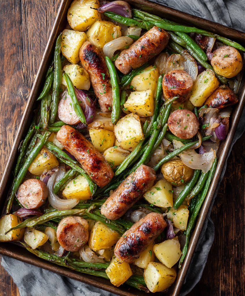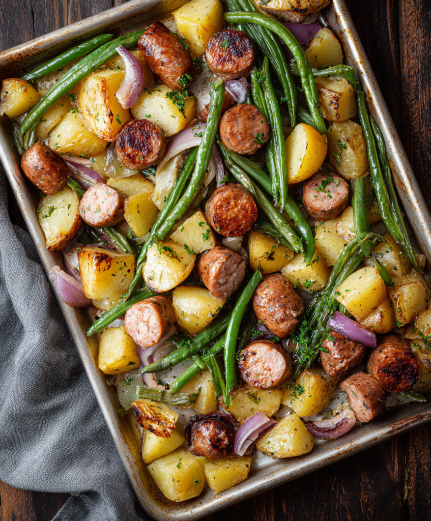 Sheet Pan Sausage Green Beans Potatoes makes weeknight dinner effortless: smoky sausage, tender potatoes, and crisp green beans roasted together in one pan.