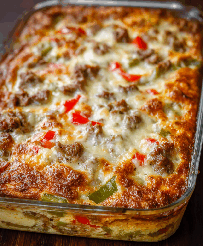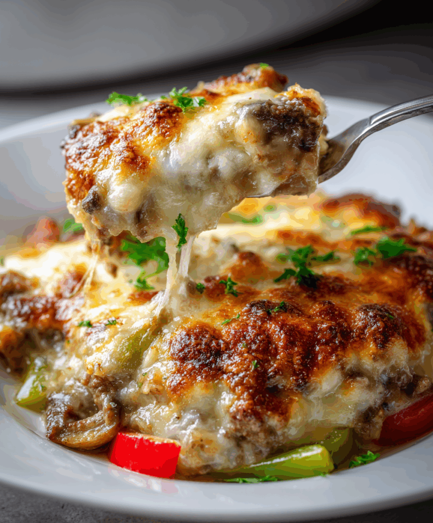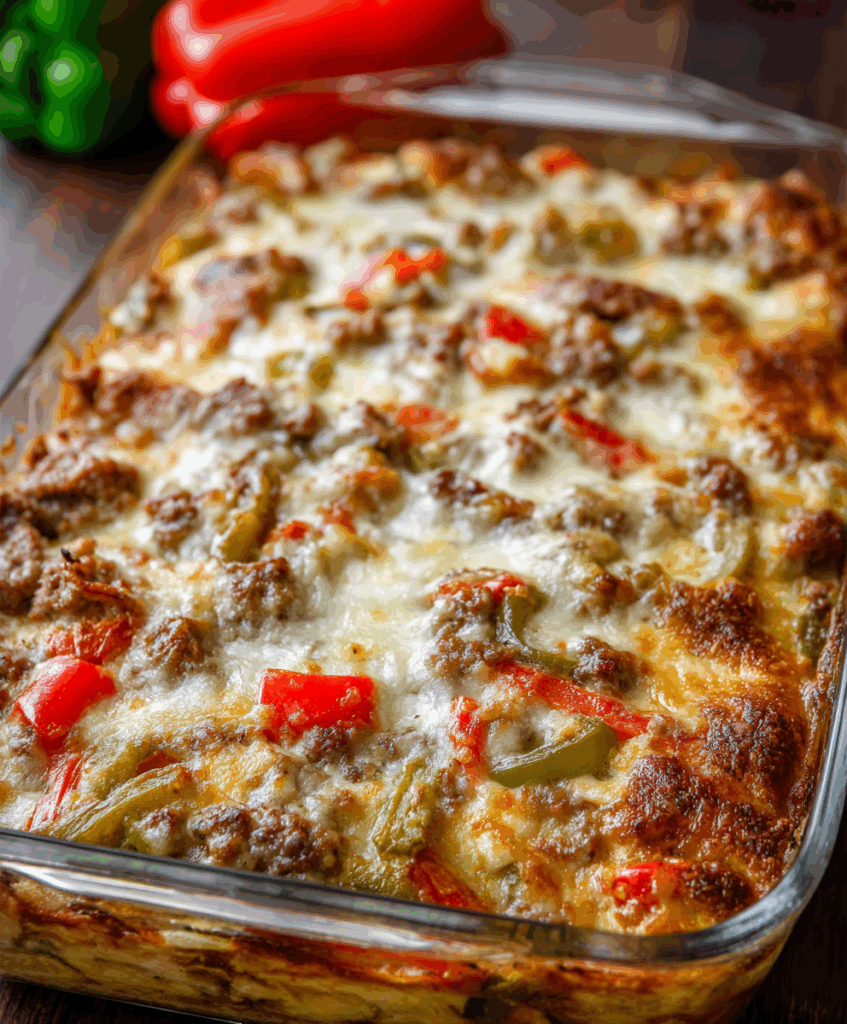 It’s hearty without being fussy: ground beef (or shaved steak if you want to go classic), bell peppers, onions, mushrooms, and a creamy, cheesy sauce that bakes under a blanket of provolone and mozzarella. Serve it with crusty bread, over rice, or spooned onto toasted hoagie rolls and you’ve basically got deconstructed cheesesteaks straight from the oven.