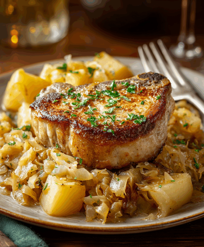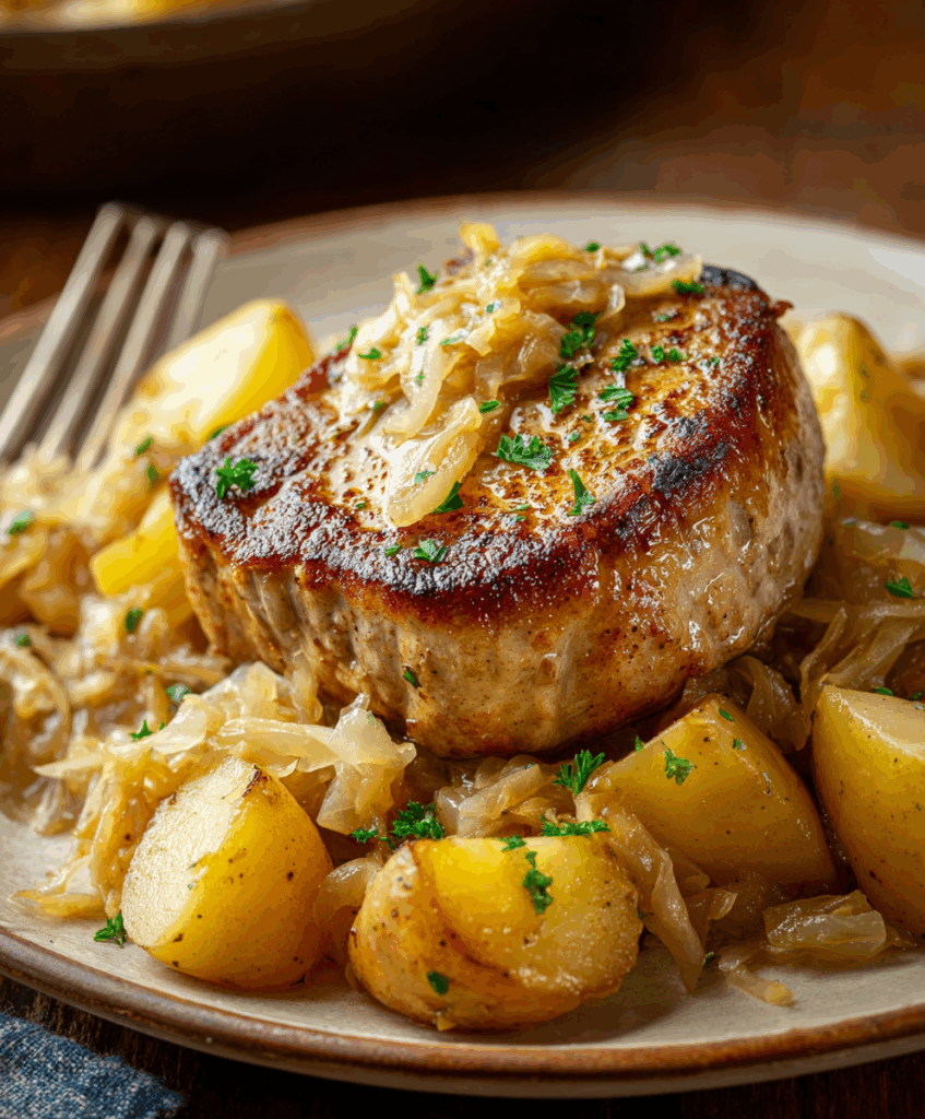 There’s something wonderfully old-fashioned about a pan of pork chops and sauerkraut bubbling away in the oven. The pork turns fall-apart tender, the sauerkraut mellows and soaks up all those meaty juices, and every bite tastes like pure comfort.