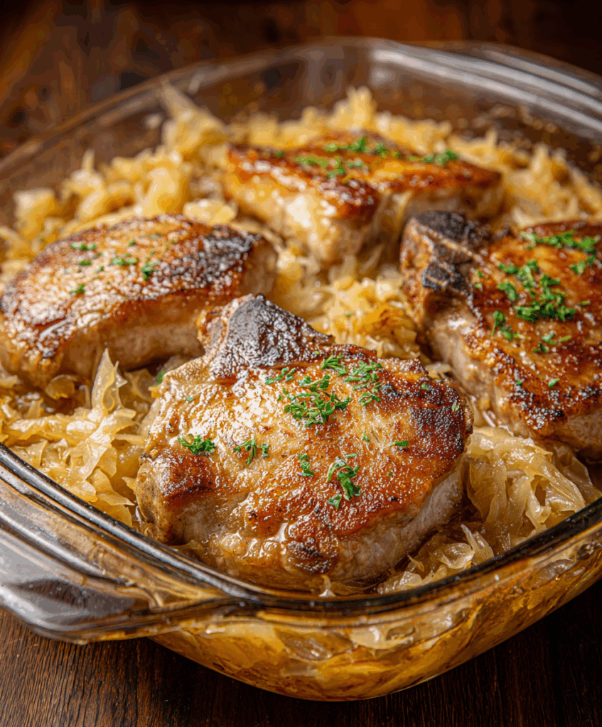 Oven Pork Chops and Sauerkraut is a cozy baked casserole with tender chops, tangy cabbage, and potatoes perfect for chilly nights.