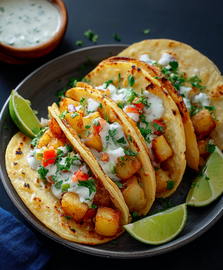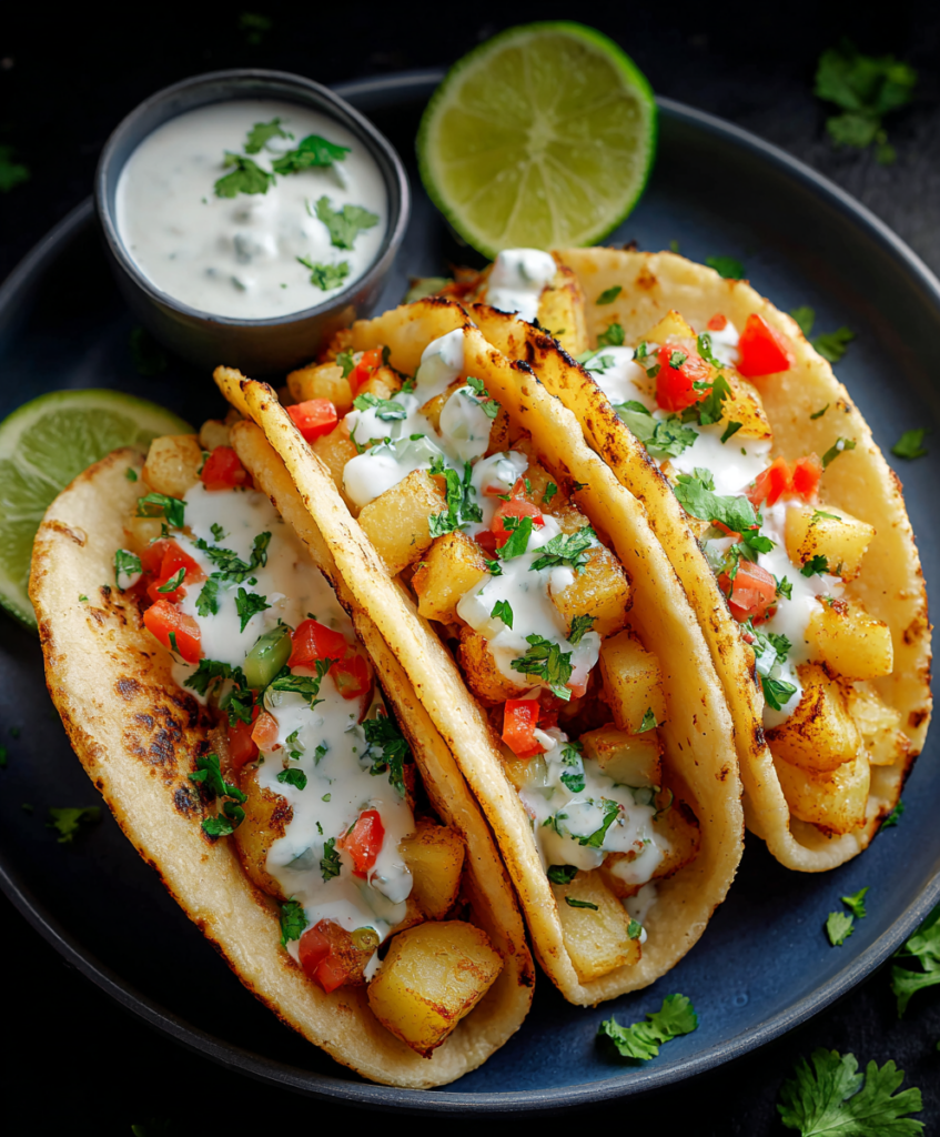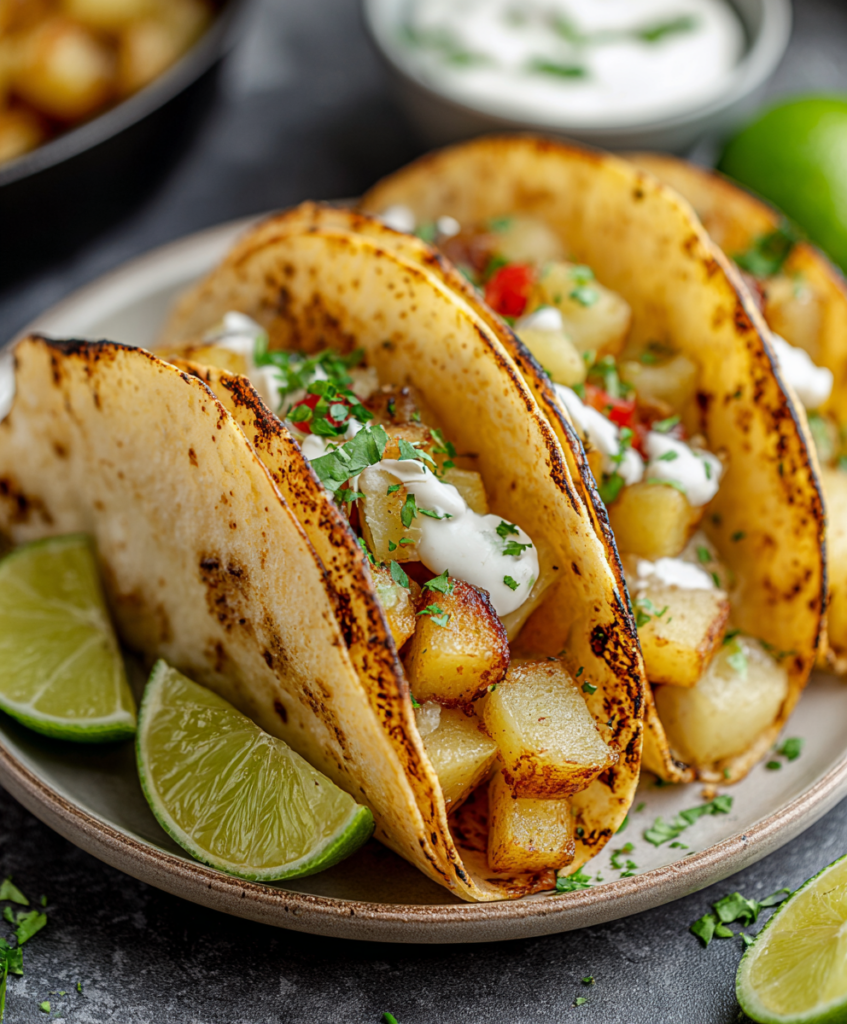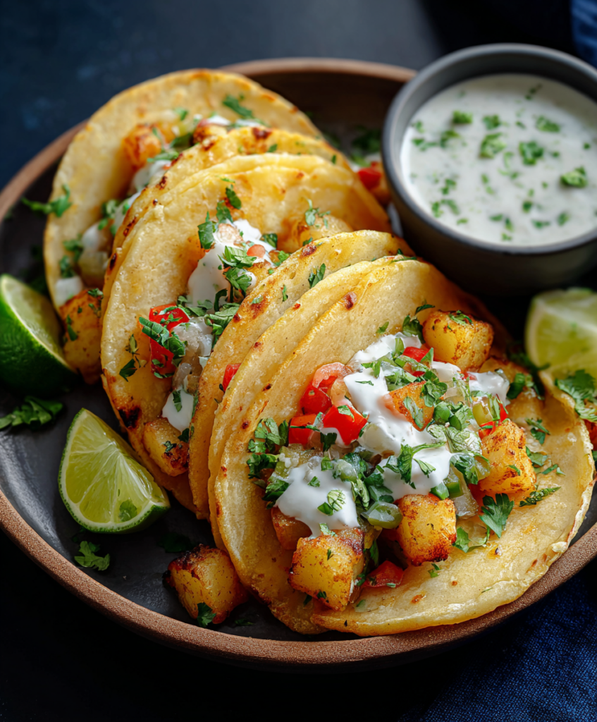 A satisfying and savory vegetarian dish, these crispy potato and green chili tacos bring together creamy spiced potatoes, fire-roasted chilies, and melty cheese inside golden corn tortillas. Ideal for meat-free meals, this recipe delivers comfort and flavor in every bite.