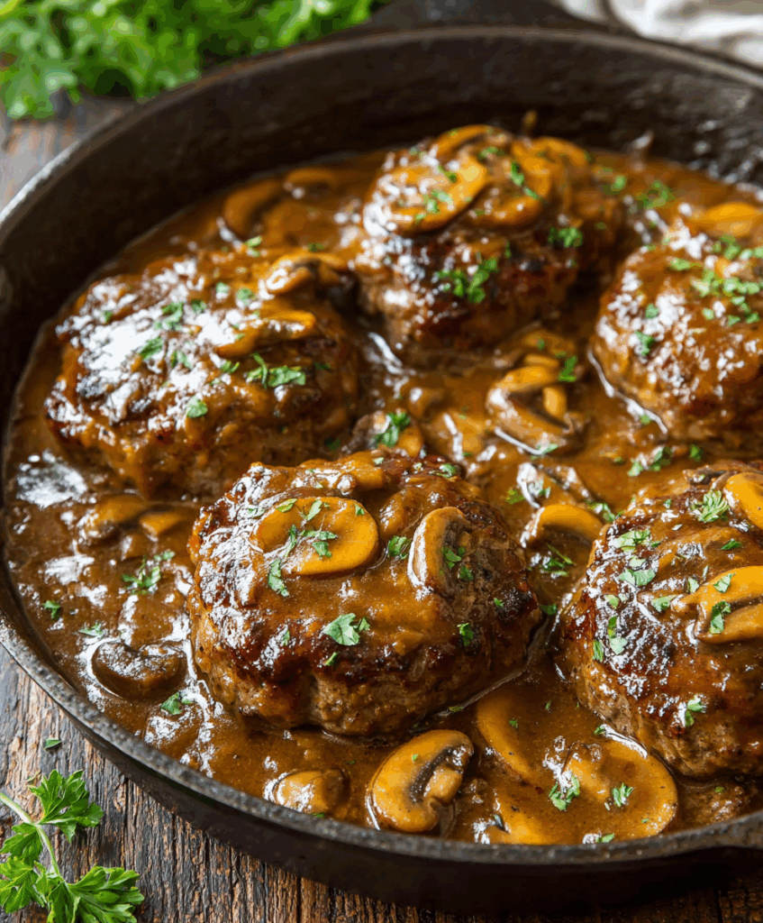 STEP 6: Nestle the seared patties back into the skillet, spooning some gravy over each one. Reduce the heat to low, cover, and simmer for 10–15 minutes, or until the patties are cooked through and the gravy is rich and glossy. Adjust seasoning and garnish with parsley before serving.
