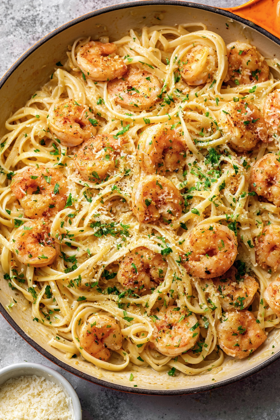 - Return the drained pasta to the skillet, tossing thoroughly to coat it in the garlic-butter mixture. Stir in half of the grated Parmesan and half of the chopped parsley. Gently fold in the cooked shrimp.