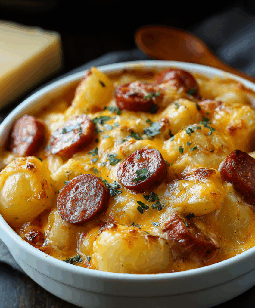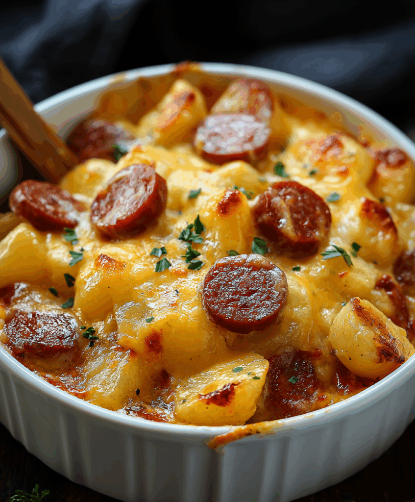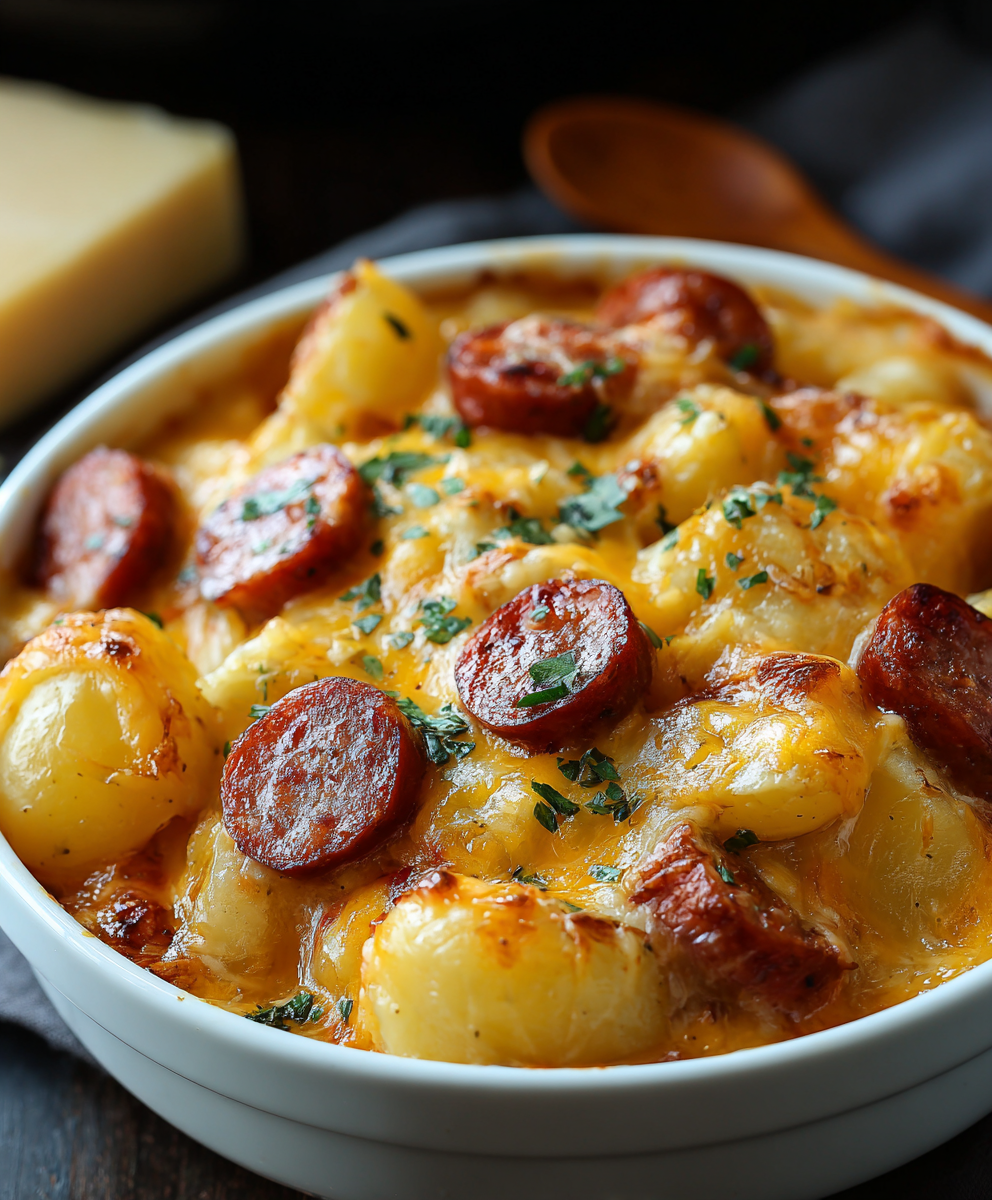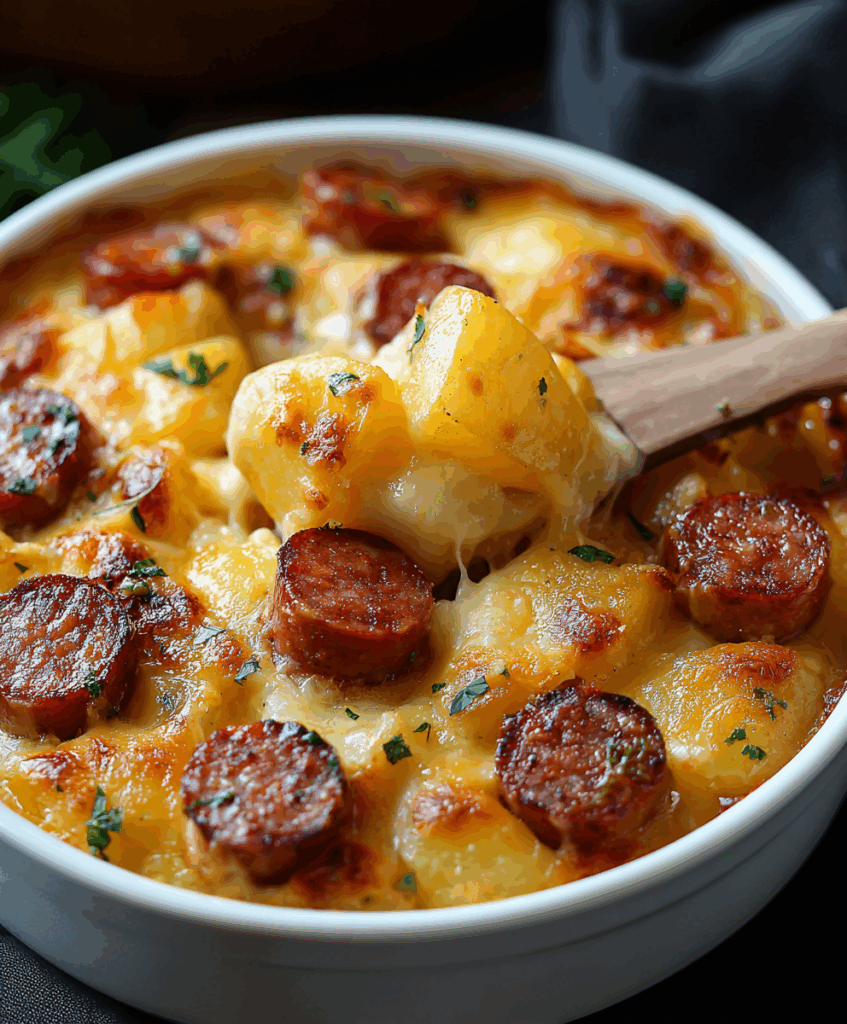 If your idea of comfort food is a bubbling casserole that makes the whole kitchen smell amazing, this dish belongs in your weeknight rotation. Every bite has soft, golden potatoes, ribbons of sharp cheddar, and those satisfying smoky rounds of sausage.