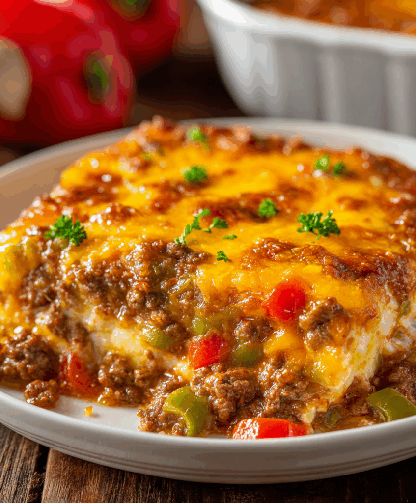 There’s comfort in a casserole that shows off both crunch and cream. This one starts with a simple, press-in biscuit base that bakes up tender under saucy heat. Over that goes seasoned ground beef with peppers, onions, and tomatoes, finished with a tangy, cheesy layer that turns bubbly and golden in the oven.