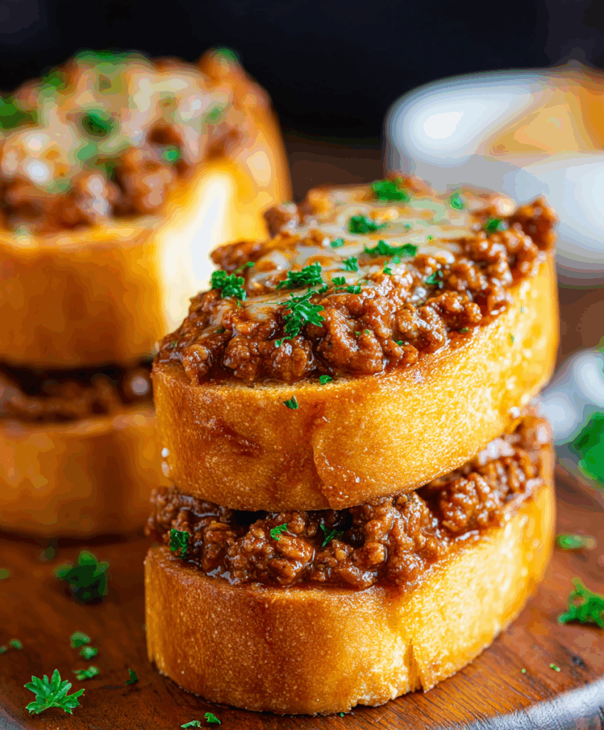 • Arrange the toasted Texas slices on a baking sheet. Spoon a hearty portion of the sloppy joe mixture onto each slice, spreading it evenly.